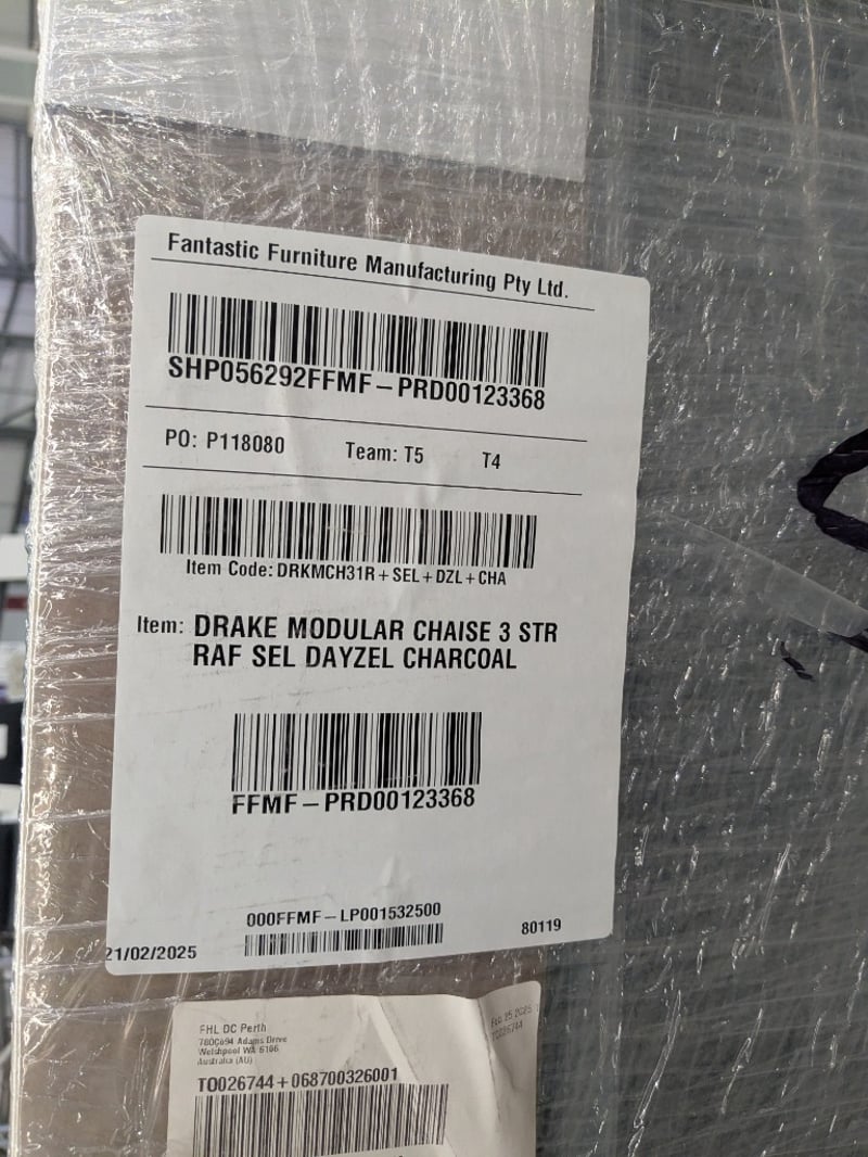 Modular Chaise for 3 Seater Sofa in Charcoal Fabric.Note: Condition is new and wrapped but some Items Have Slight Scuff Marks, damaged & Stains, Some Items Marked Warehouse Rejected PARTS MAY BE MISSING, INSPECTION HIGHLY RECOMMENDED PARTS MAY BE MISSING, INSPECTION HIGHLY RECOMMENDED. PARTS MAY BE MISSING, INSPECTION HIGHLY RECOMMENDED.Bid per each.