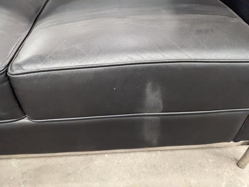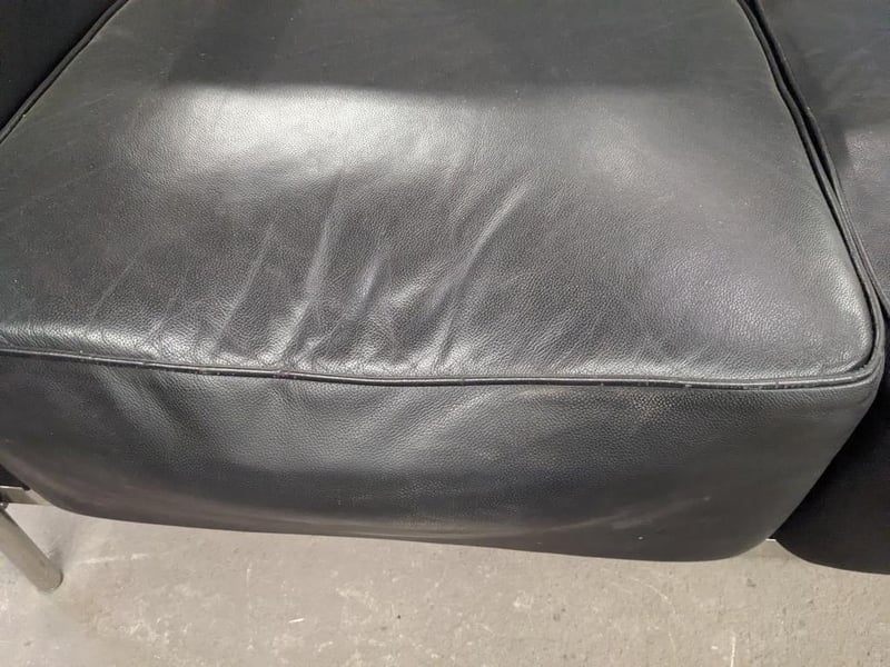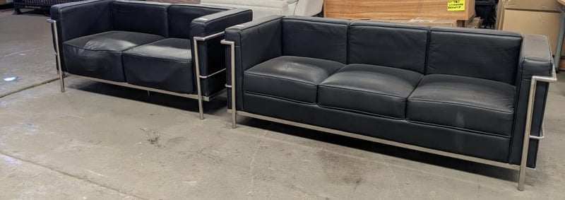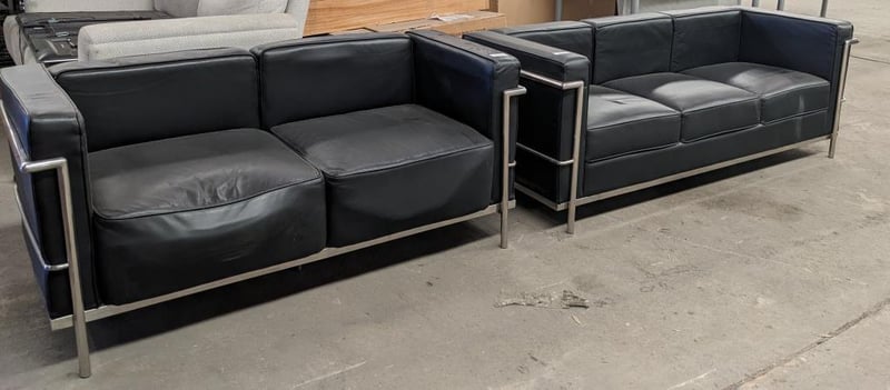 Sofa - Replica Le Corbusier, 3-seat, black vinyl, chrome frame Dims for 2 seater lounge: H: 67 x L: 180 x D:70 Dims for 3 seater lounge: H: 67 x L: 146 x D: 70 Note: may have signs of wear and tear. Sold as a lot.