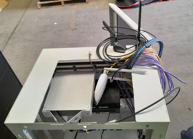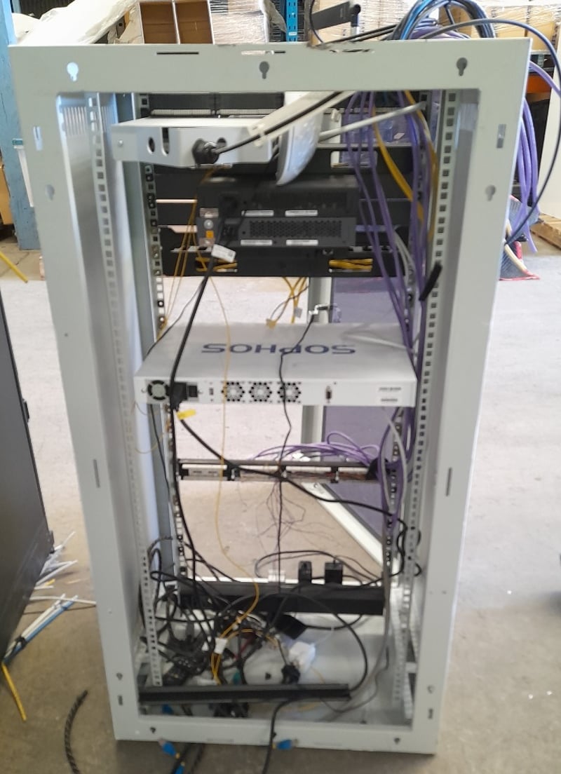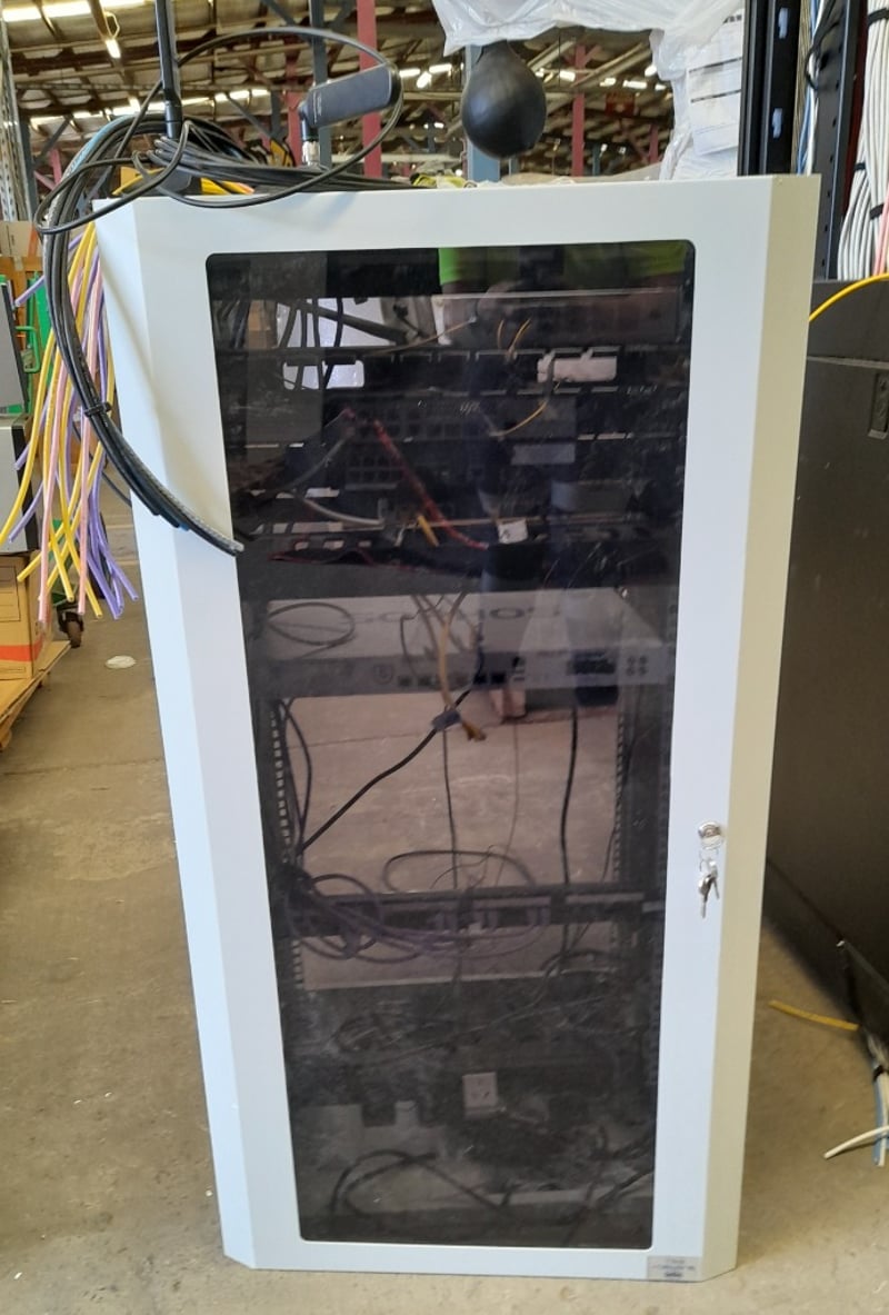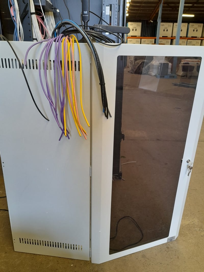 Network Cabinet - B&R, beige steel, wall mounted, 24U, enclosed, installed with 2x 24-port patch panels, 2x coaxial patch panels, 2x cable management panels, 2x Huawei switches