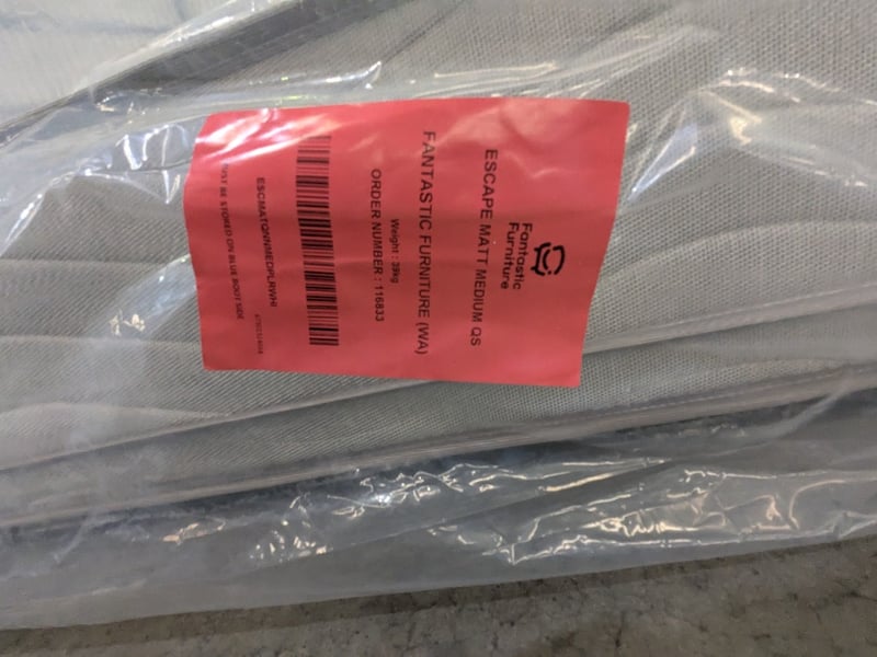 RRP$689 Escape Mattress, Orthopedic Mattress Medium New in Wrap / Box, Good Condition, On-site Inspection Recommended Size: Queen Approximate Dimensions: H 205cm x W 153cm x D 35cm Note: Some Items Have Slight Scuff Marks & Stains, Some Items Marked Warehouse Rejected PARTS MAY BE MISSING, INSPECTION HIGHLY RECOMMENDED PARTS MAY BE MISSING, INSPECTION HIGHLY RECOMMENDED Sold as Lot