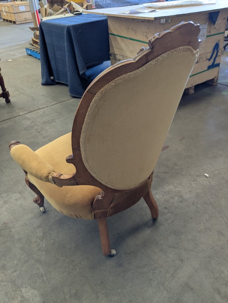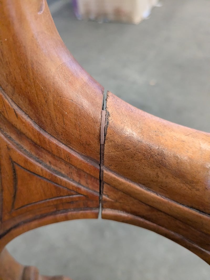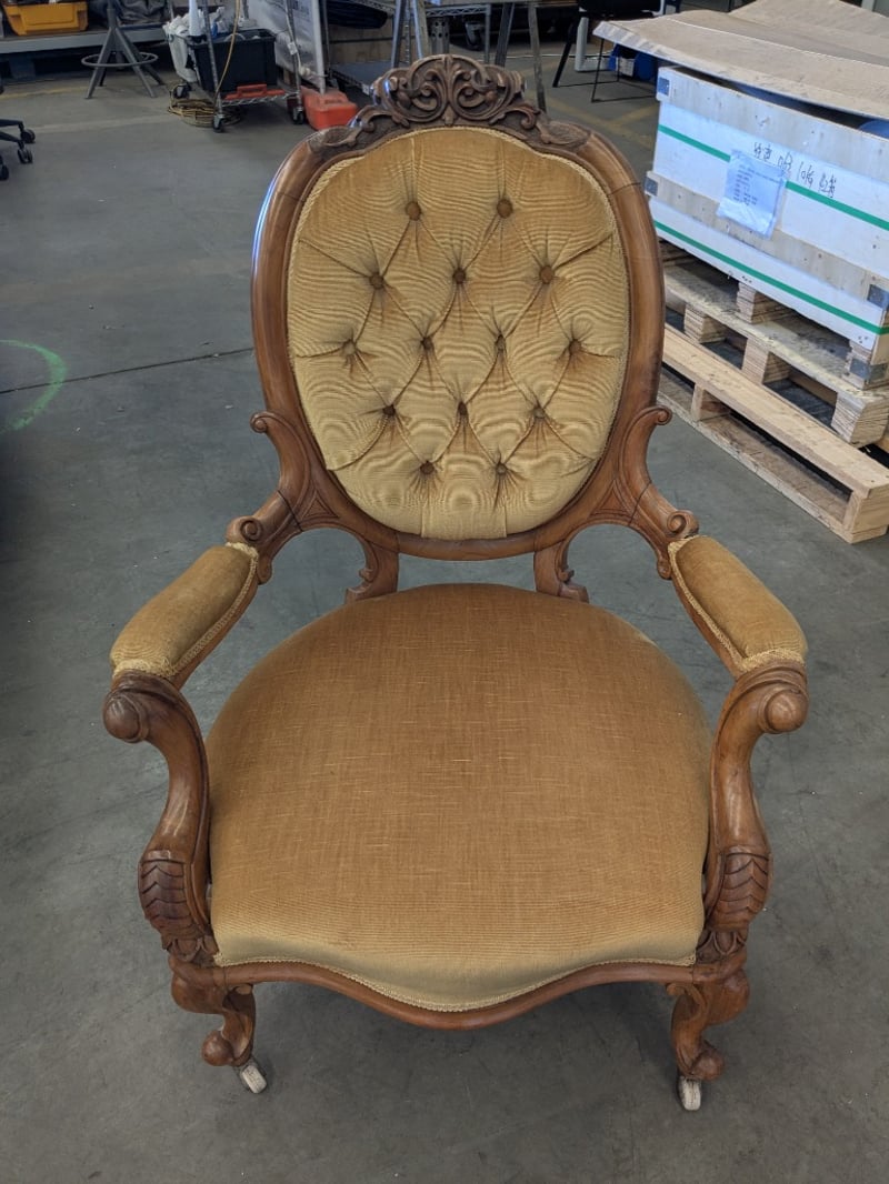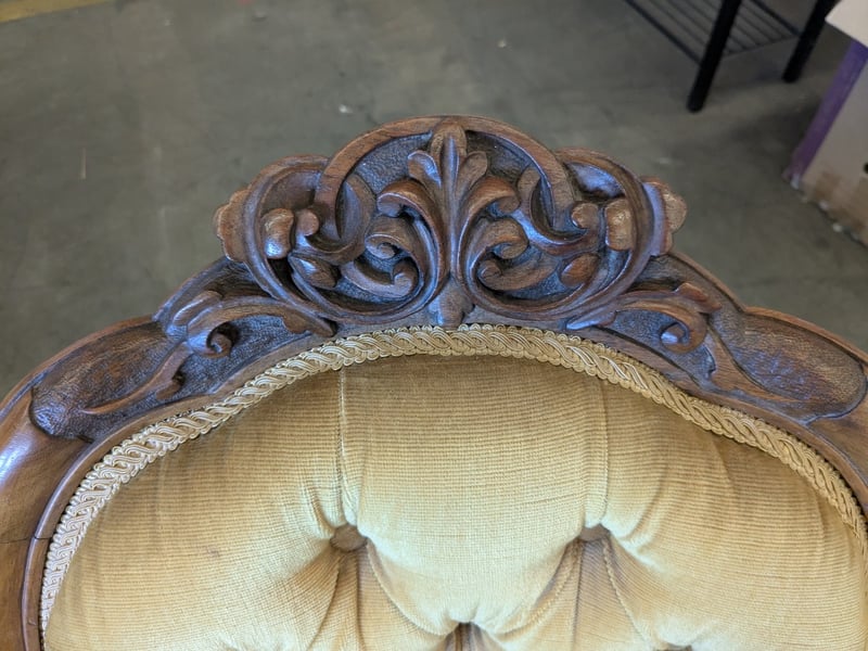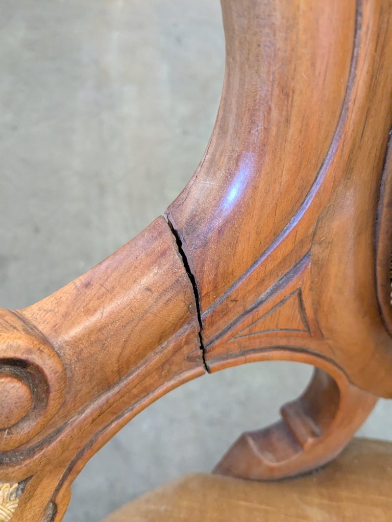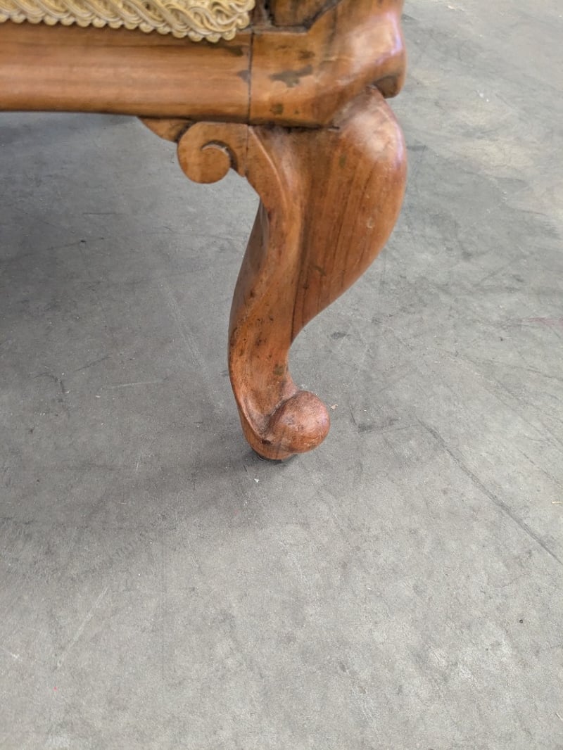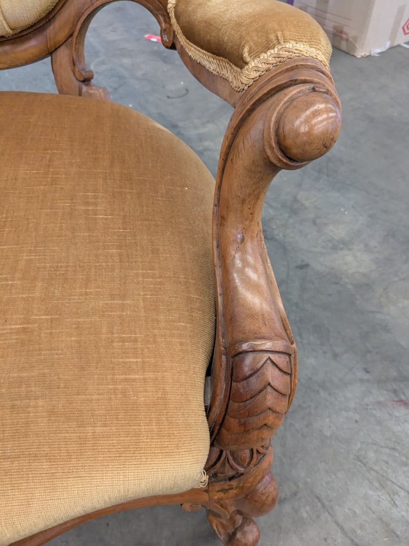 Antique Style Grandfather Chair in Walnut style Wood. Ornate Dimple Cushion Arm Chair, Timber Finish with Carved Filigree.Note : Damage to Arms, Cracked. Inspections Recommended.