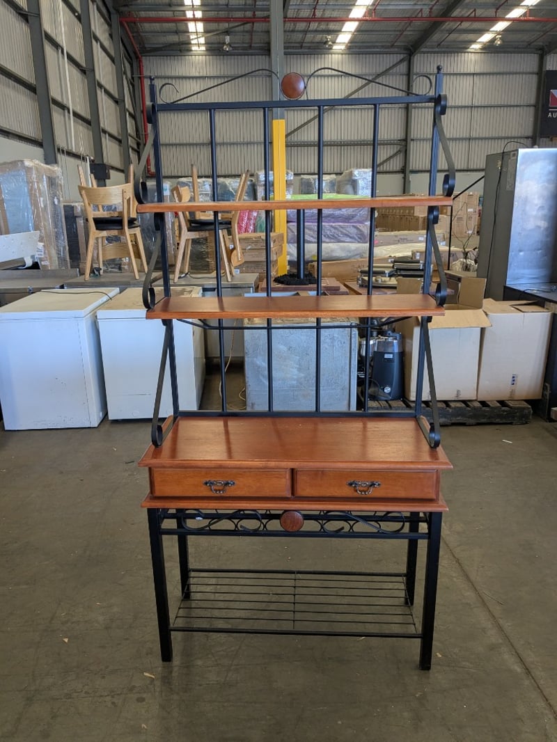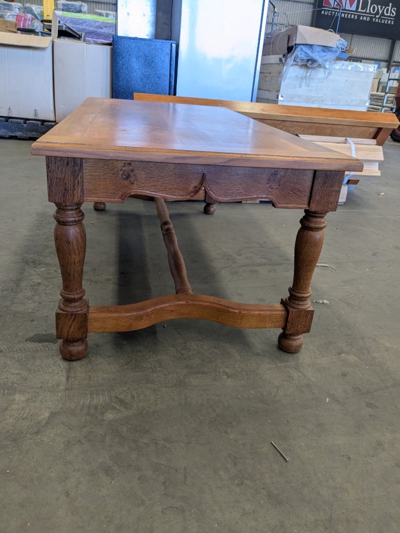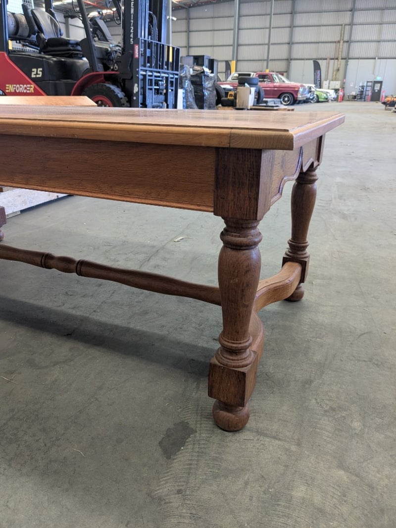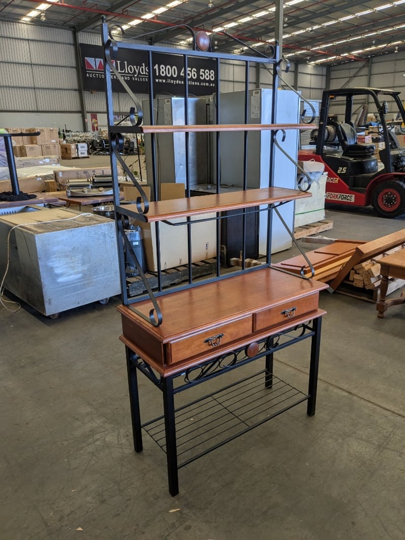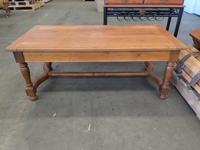 Handmade English Oak-Style Coffee Table with Turned Legs, Wood and Metal Baker’s Shelving Unit, and Yewe-Style Double Bed Frame.