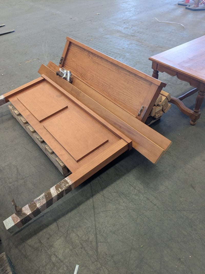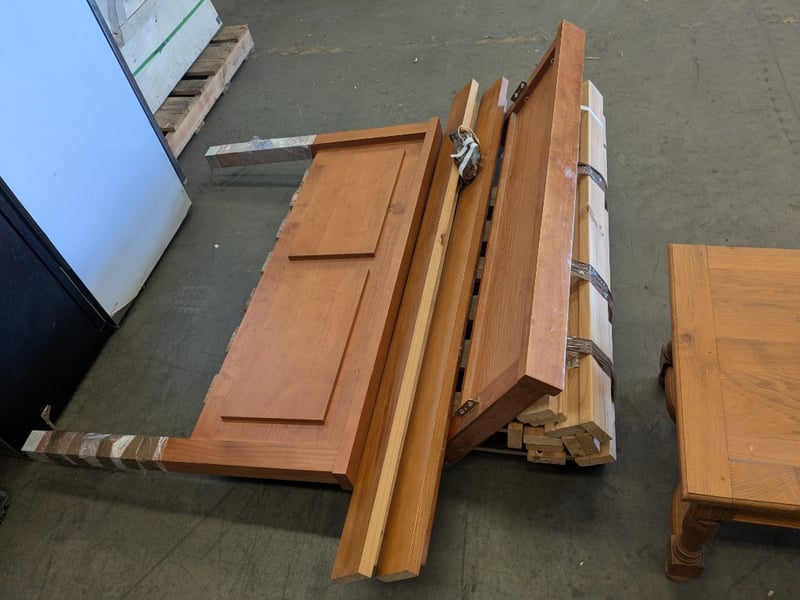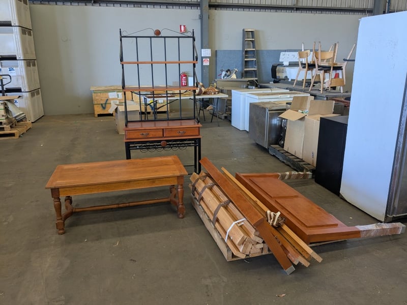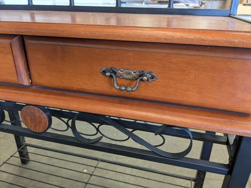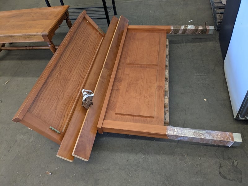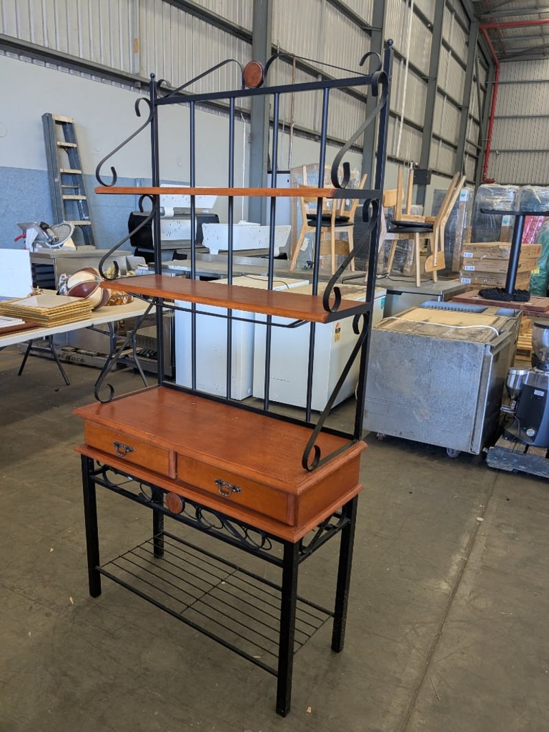 Handmade English Oak-Style Coffee Table with Turned Legs, Wood and Metal Baker’s Shelving Unit, and Yewe-Style Double Bed Frame.