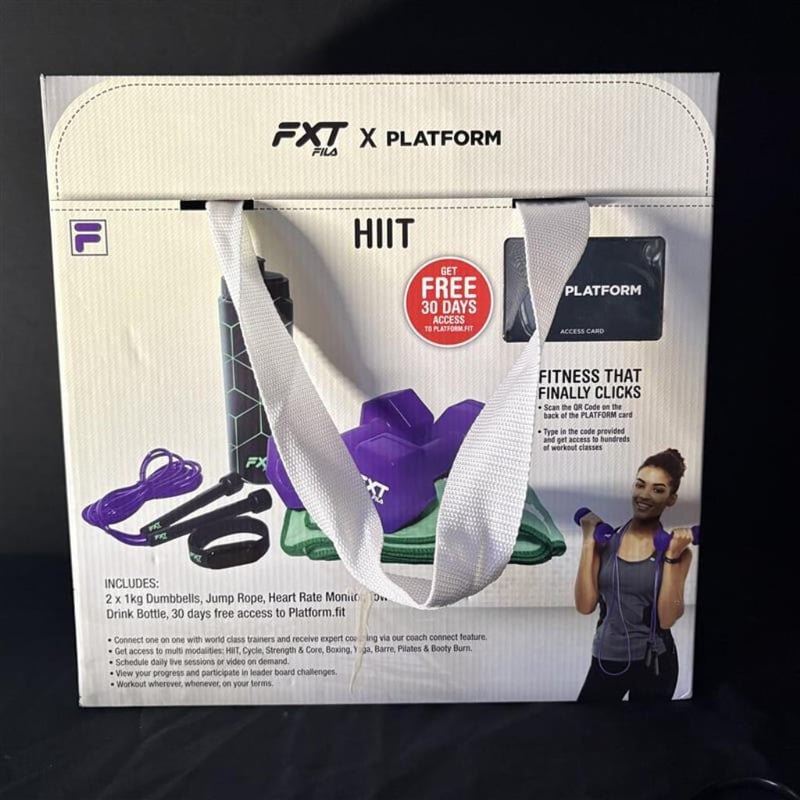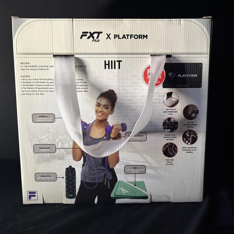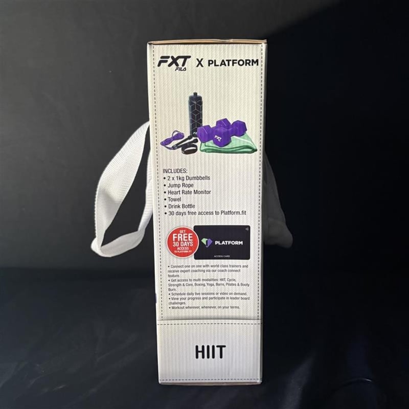 FXT FILA x Platform HIIT Fitness Kit. Sealed. Includes; 2x 1KG Dumbbells, Jump Rope, Heart Rate Monitor, Towel, and Drink Bottle.