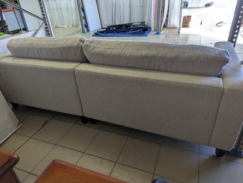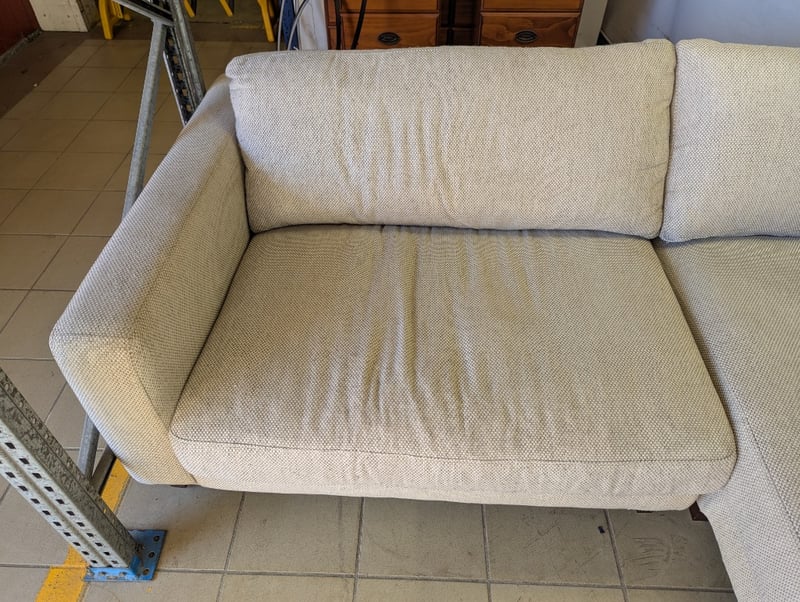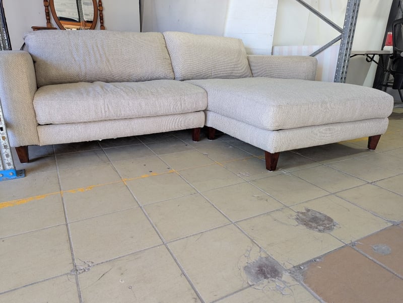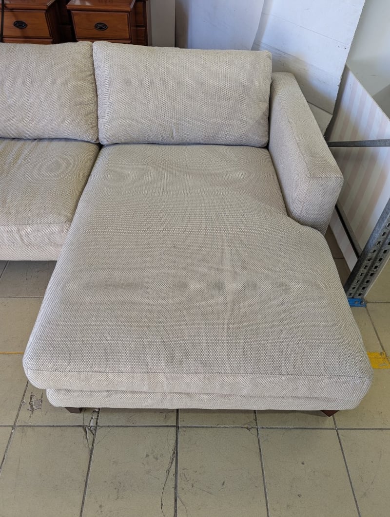 Couch with chaise, timber frame, latte finish upholstery Dimensions: H 85cm x W 245cm x D 190cm