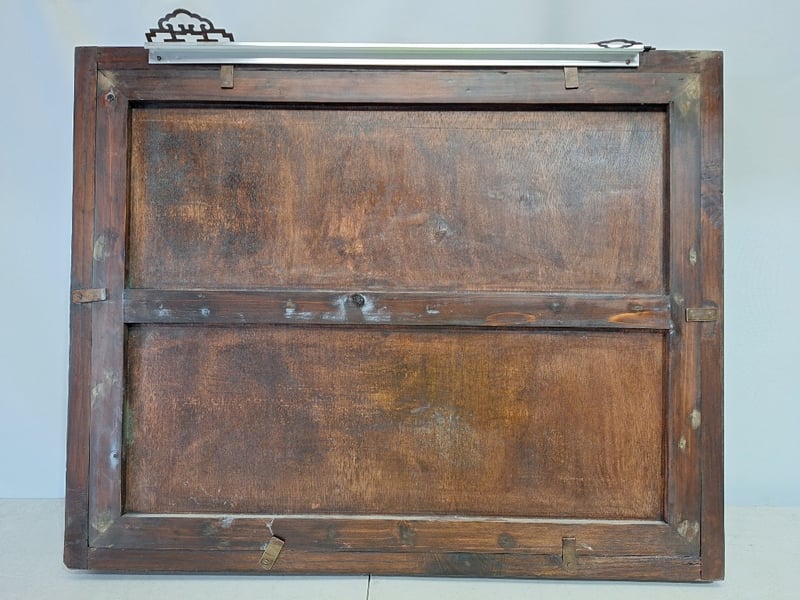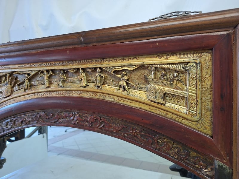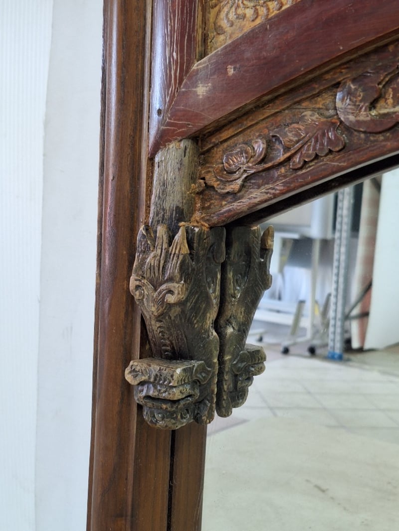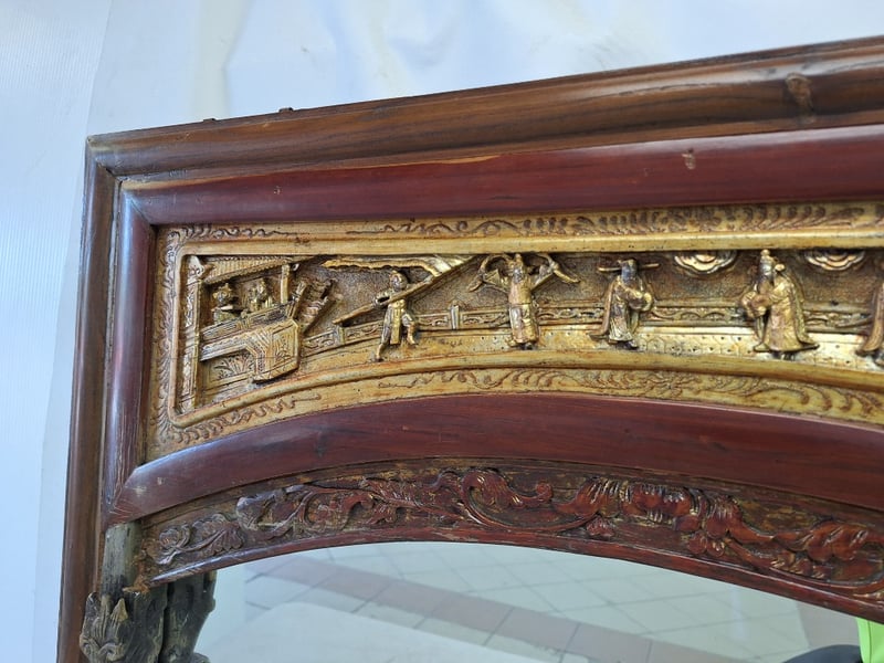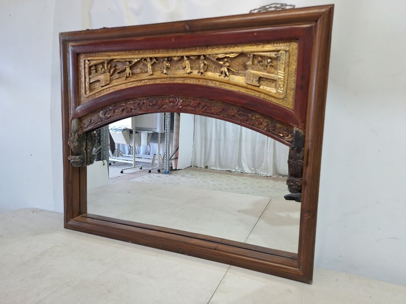 Chinese Mirror With Decorative Panel At The Top, Timber Style, Brown & Gold Finish Dimensions H:65cm W:80cm D:6cm