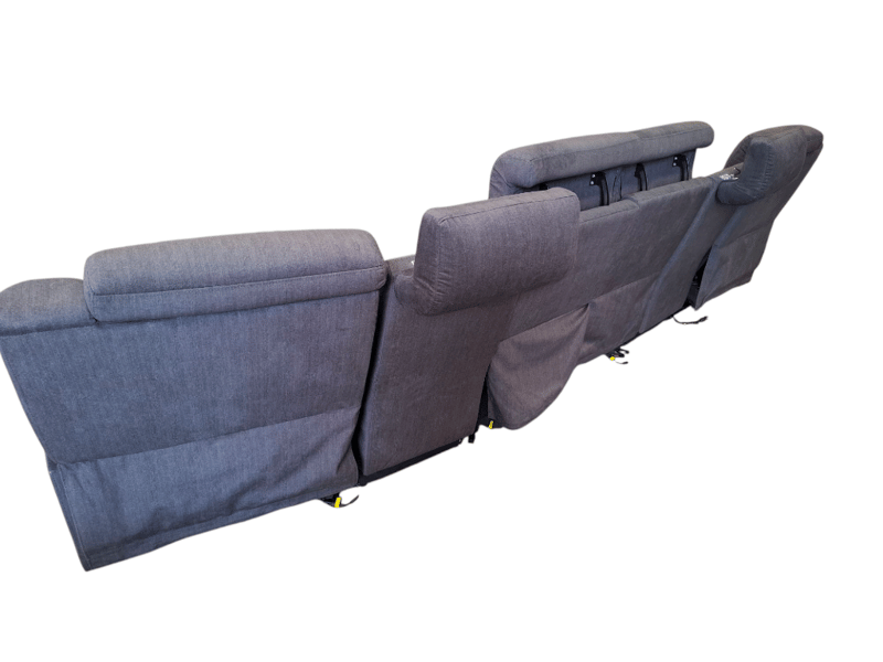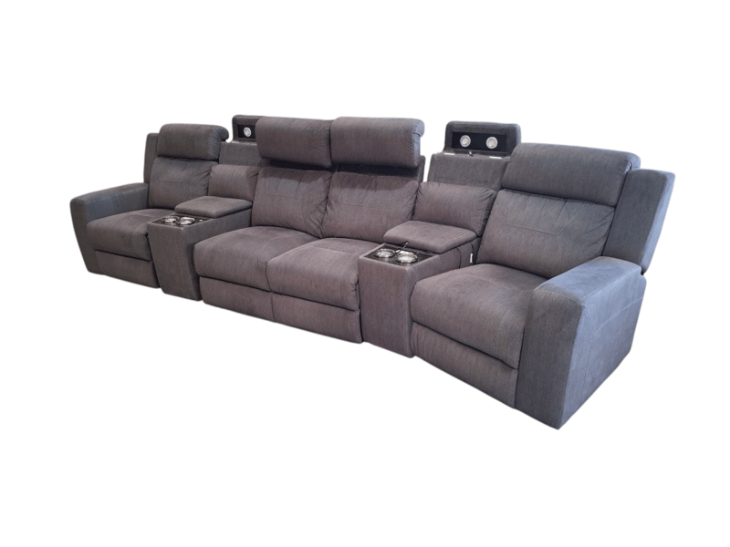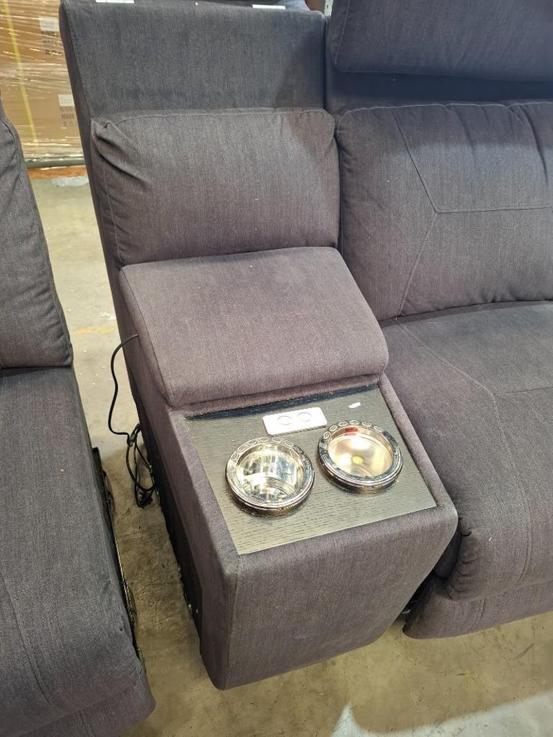 Electric recliner couch, 4 seater, Gray colour, Cup Holders, 2 storages, read lights, adjustable headrest, LED lightsDIMENSIONS: 112cm H × 352cm W × 75cm DNOTE: SCUFFS AND MARKS, WORKING CONDITIONS UNKNOWN, CLEANING REQUIRED, HEADREST JAMMED