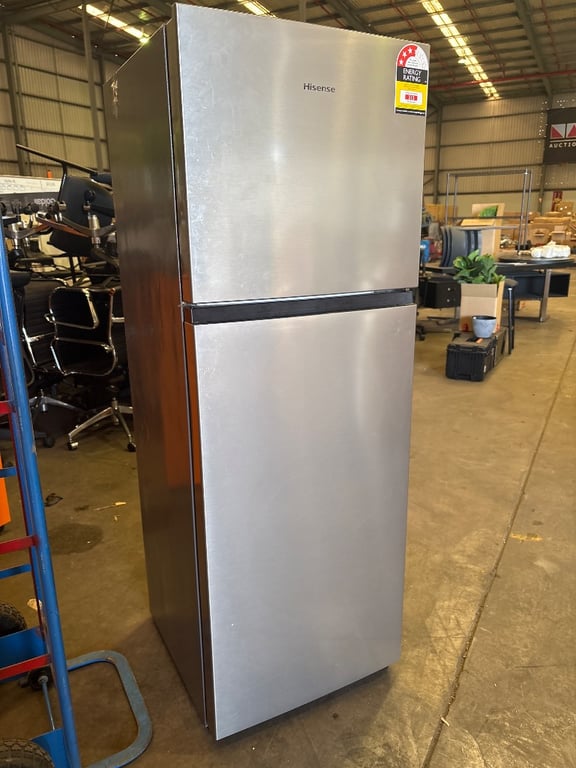 Hisense Refrigerator/Freezer – Model HRTF326S Stainless steel Hisense top mount refrigerator with freezer on top and fridge below. Interior includes adjustable shelving, door storage, and fruit & vegetable crisper. Brand: Hisense. Model: HRTF326S. Serial No: H32R0321BBRAF. Total Volume: 326L (Fridge 253L, Freezer 73L). Rated Voltage: 220–240V. Frequency: 50Hz. Rated Current: 0.8A. Defrost Power: 175W. Lamp Power: 1W. Energy Consumption: 0.857kWh/24h. Refrigerant: R600a (34g). Net Weight: 56kg. Condition: Untested. Exterior shows minor wear.