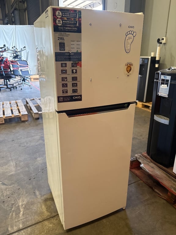 CHiQ Refrigerator – Model CTM216WWhite CHiQ top mount refrigerator with freezer on top and fridge below. Interior includes glass shelving, door storage, and crisper drawer. Unit shows cosmetic wear including marks and stickers to exterior. Brand: CHiQ. Model: CTM216W. Serial No: CHML200623CTM21EW00295. Gross Capacity: 216L. Storage Volume: 201L (Fridge 148L, Freezer 53L). Rated Voltage: 220–240V. Frequency: 50Hz. Current: 0.43A. Energy Consumption: 265kWh/year. Refrigerant: R600a (39g). Weight: 45kg. Dimensions: (H) 146.5cm x (W) 54.5cm x (D) 59cm.Condition: Untested. Exterior has cosmetic wear. Interior shelving and drawers intact.
