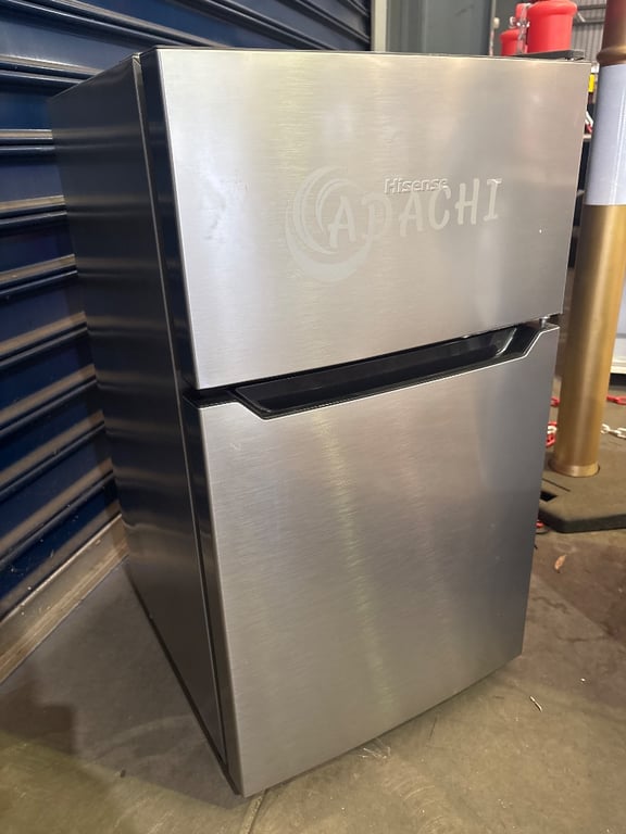 Hisense Refrigerator – Model HR6TF92SStainless steel finish compact refrigerator with freezer compartment and lower fridge section. Unit shows some cosmetic marks and minor dents to exterior. Interior shelving and compartments included. Brand: Hisense. Model: HR6TF92S. Serial No: H9CR0191BEFMQ. Gross Capacity: 92L. Storage Capacity: 91L. Energy Consumption: 0.742kWh/24h. Power: 220–240V AC, 50Hz, 0.6A. Refrigerant: R600a (33g).Condition: Untested. Exterior has minor dents/scratches. Interior appears complete with shelving and drawers.