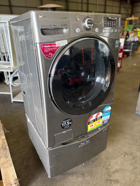 LG Front Load Washer Dryer – Model WDC1215HSVEStainless steel LG fully automatic front load washer/dryer with direct drive motor and TrueSteam technology. Large capacity with 15kg wash and 8kg dry cycles. Features include digital controls, multiple wash/dry programs, and energy/water efficiency ratings. Brand: LG. Model: WDC1215HSVE. Serial No: 809KWVQ81007. Product Code: F2K2CHK2T.ASSREAP. Dimensions: (H) 99cm x (W) 70cm x (D) 77cm. Power: 220–240V, 50Hz. Wash: 2000–2250W. Dry: 2100–2300W. Made in Korea.Condition: Used. Exterior shows scratches, marks, and wear from use. Untested – working condition not confirmed.