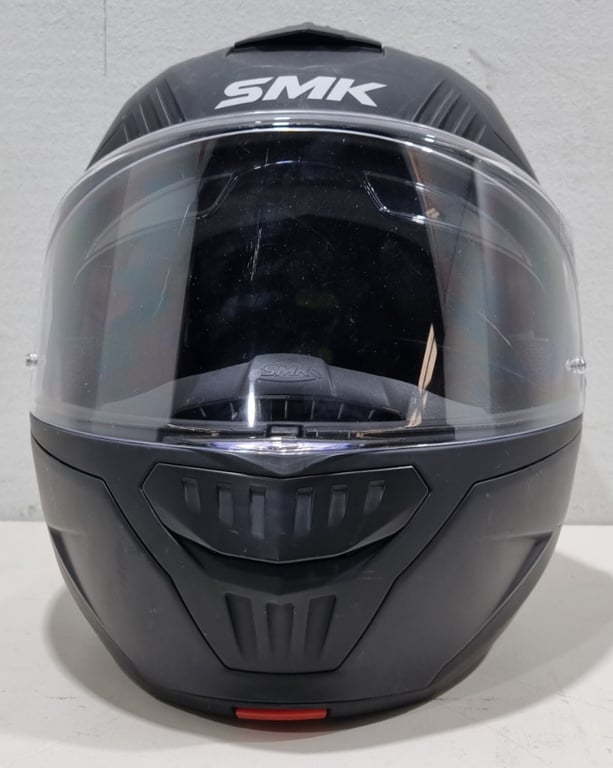 SMK black motorcycle helmet.