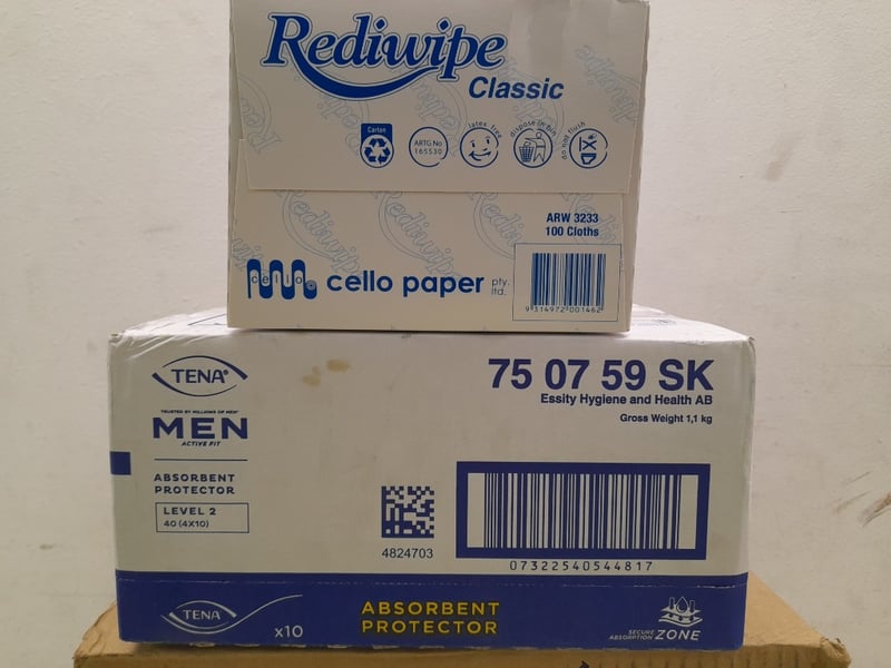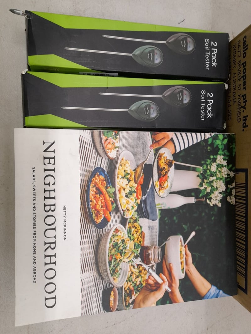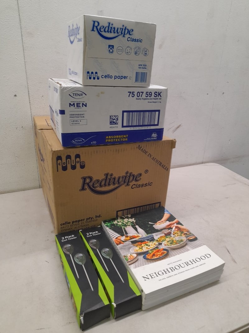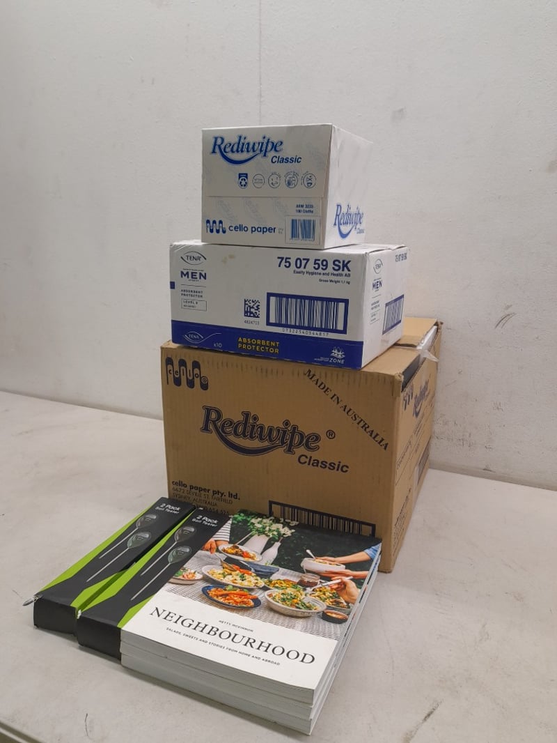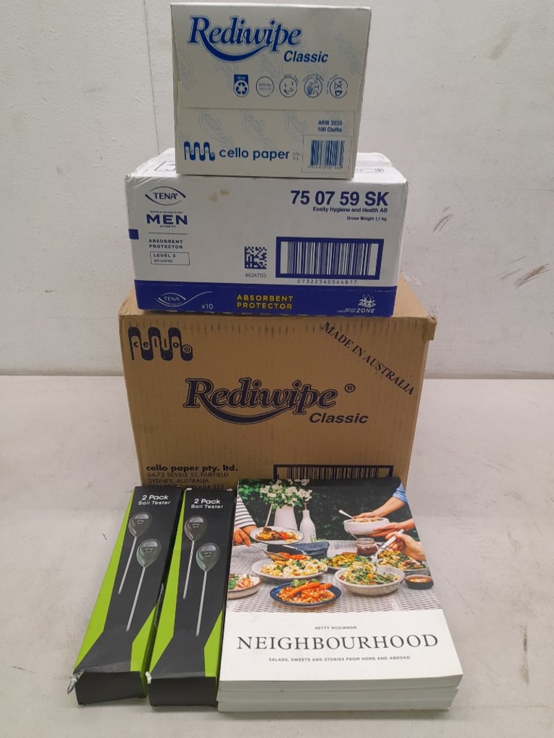 Cookbooks, Soil Testers, Tena Men Absorbent Protectors, & 8 Boxes of Cello Rediwipe Wipes