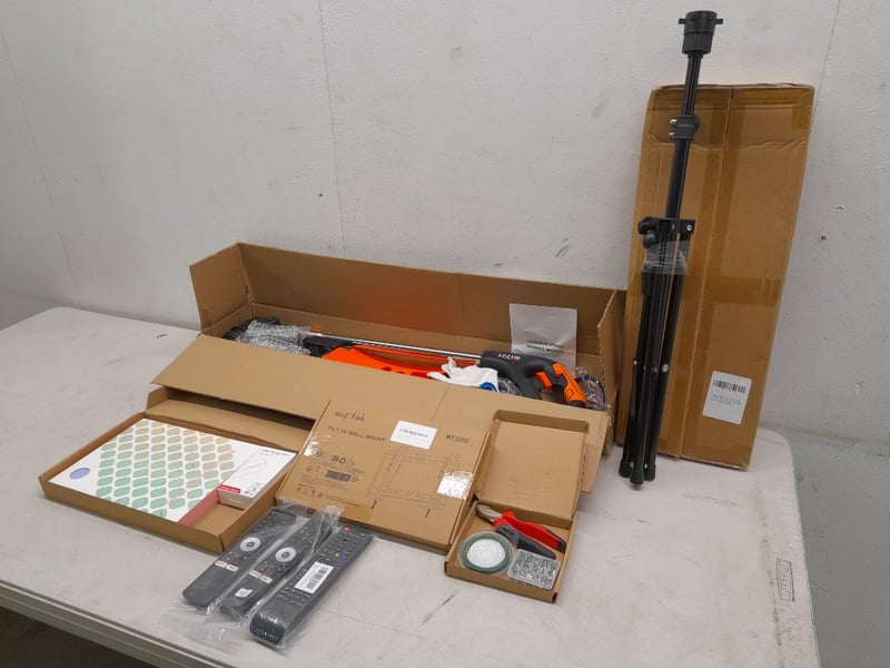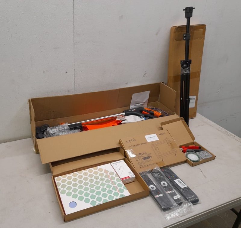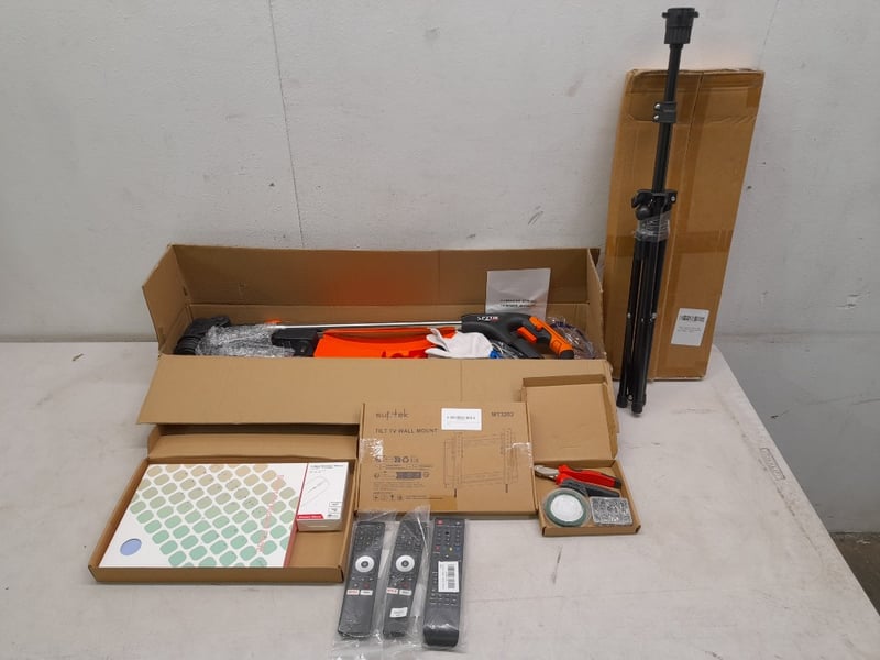 Cordless String Trimmer, Wireless Keyboard & Mouse, TV Wall Mount, Wooden Monitor Stand, Tripod, Pliers & 3 Remotes Sold as lot
