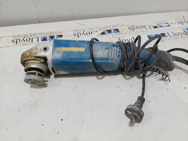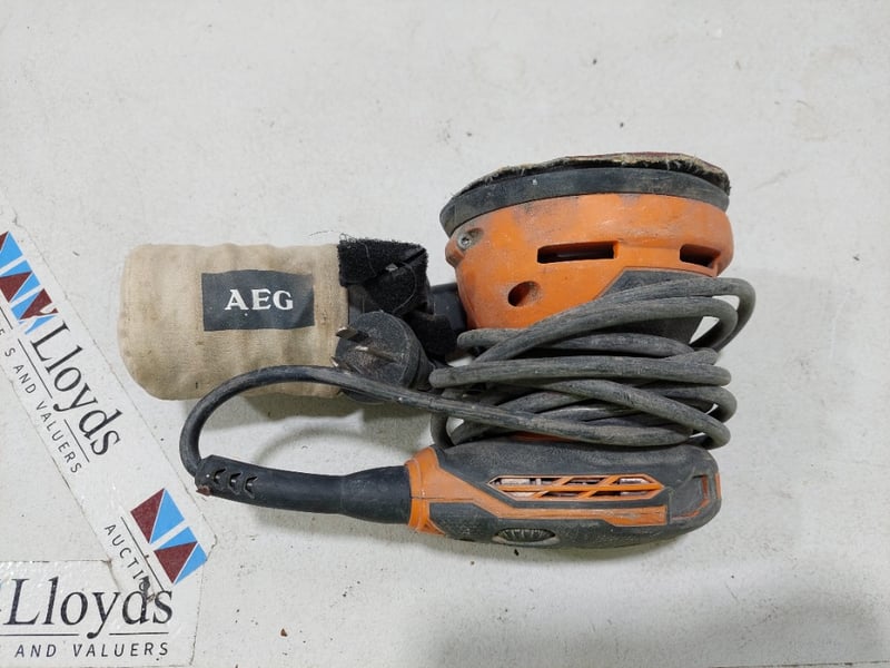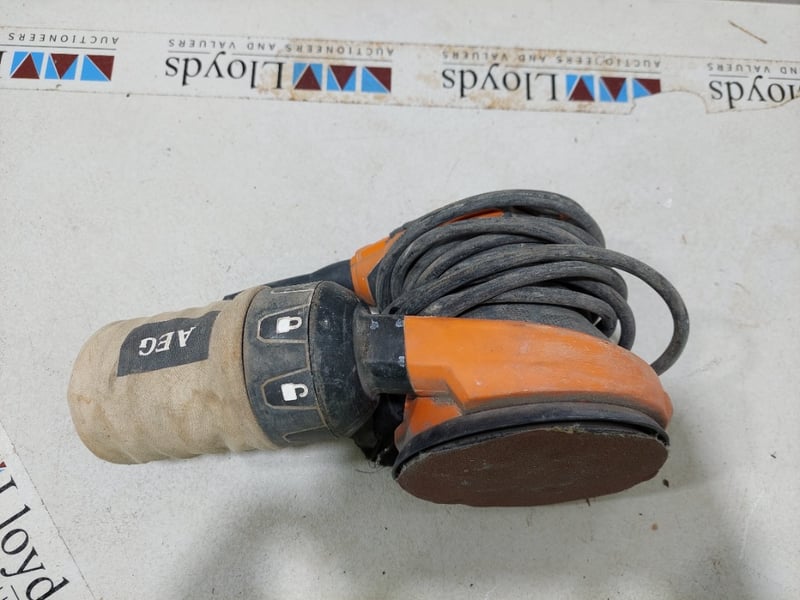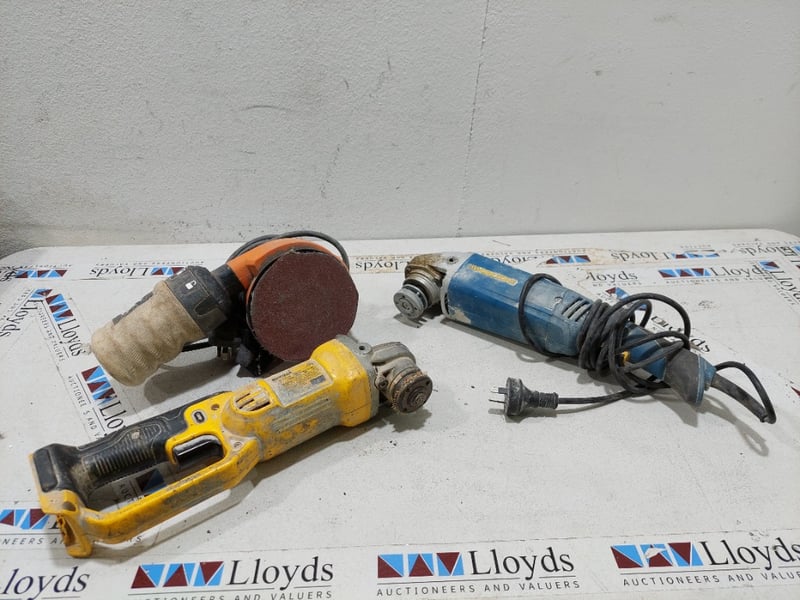 Assorted power tools, includes AEG electric sander, workzone angle grinder and DeWalt cordless angle grinder.