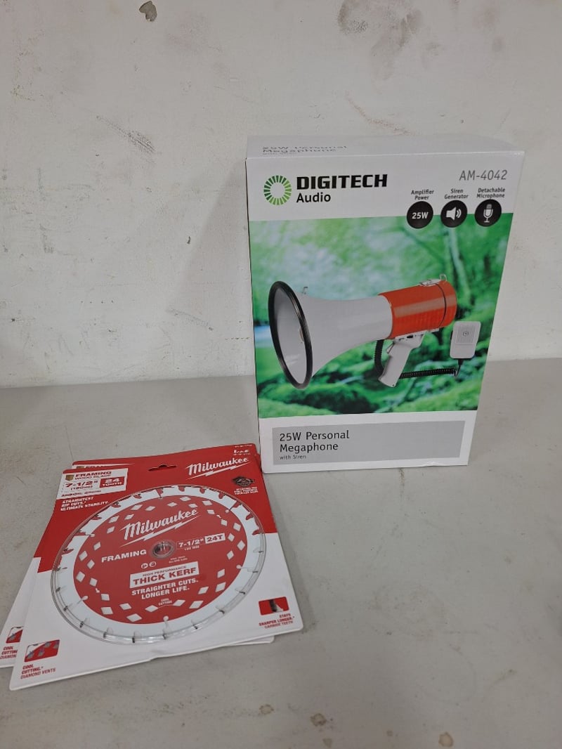 Machinery/Parts Digitech 25W Personal Megaphone With Siren, Model AM-4042 & x3 Milwaukee Thick Kerf Framing Circular Saw Blades SOLD AS LOT