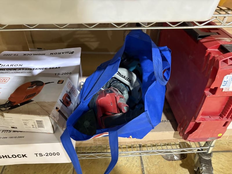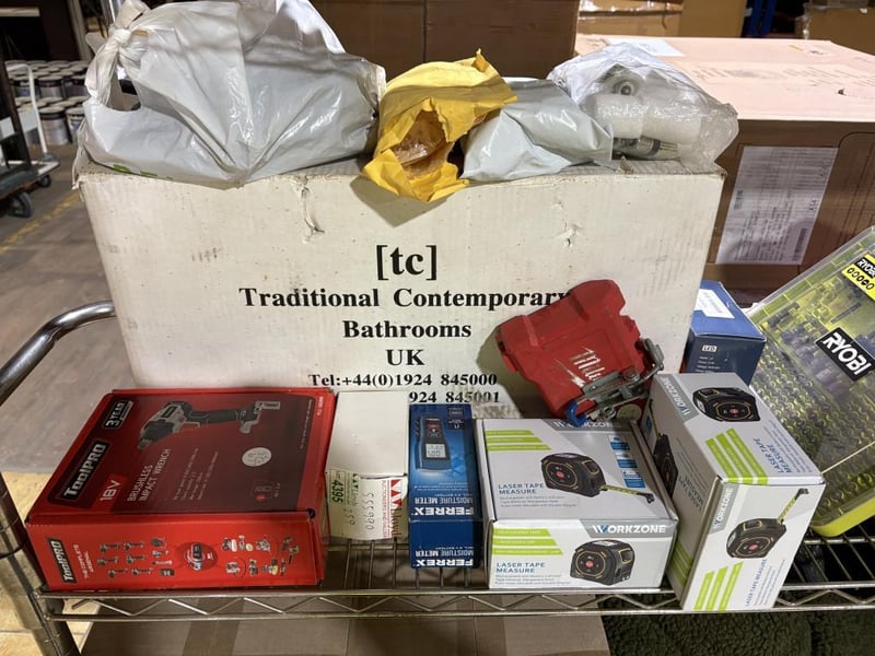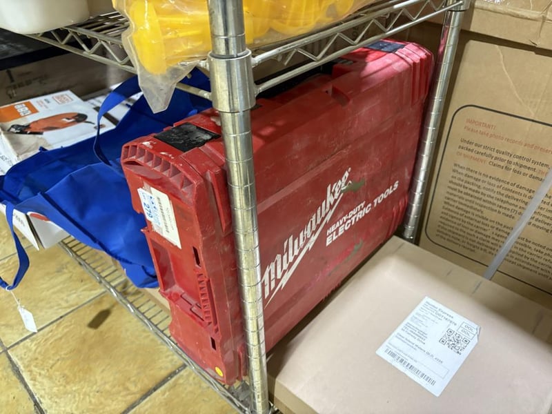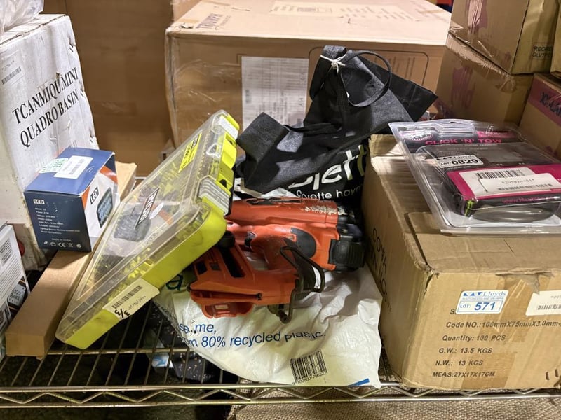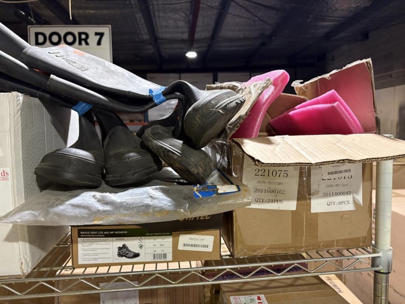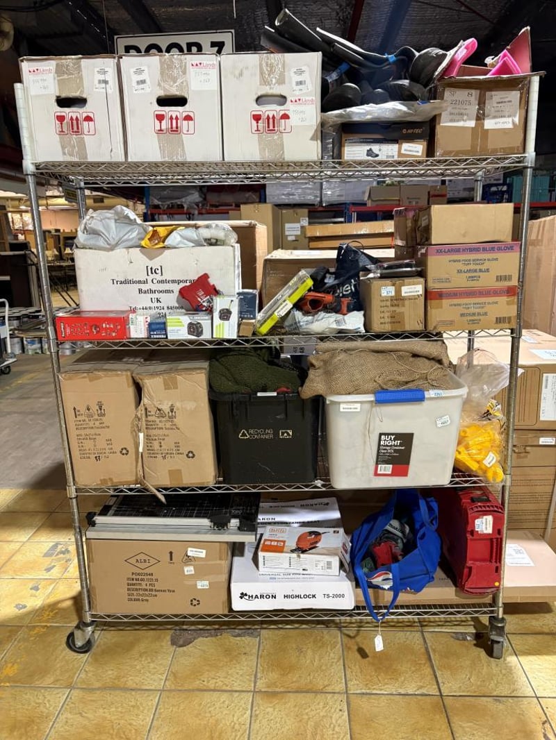 Assorted Rack of abandoned DIY goods, Includes: Boots, Vanity Shrouds, New in Box Tools, Assorted used tools, Gloves, Terracotta Pots, Bathroom Accessories and more.SOLD AS LOTNote: Pick-Up Only, Rack Not Included