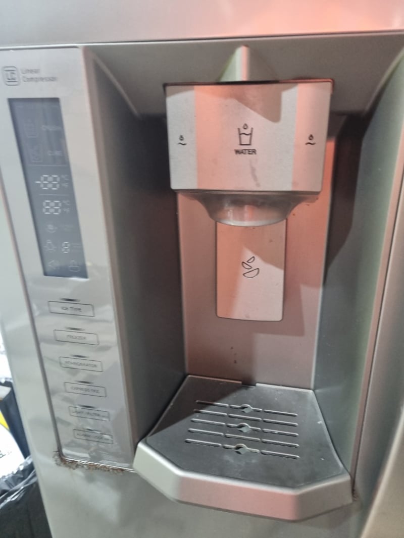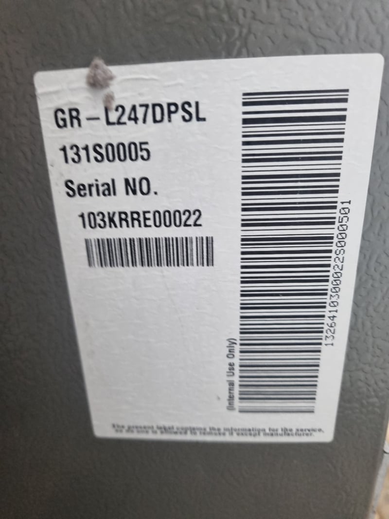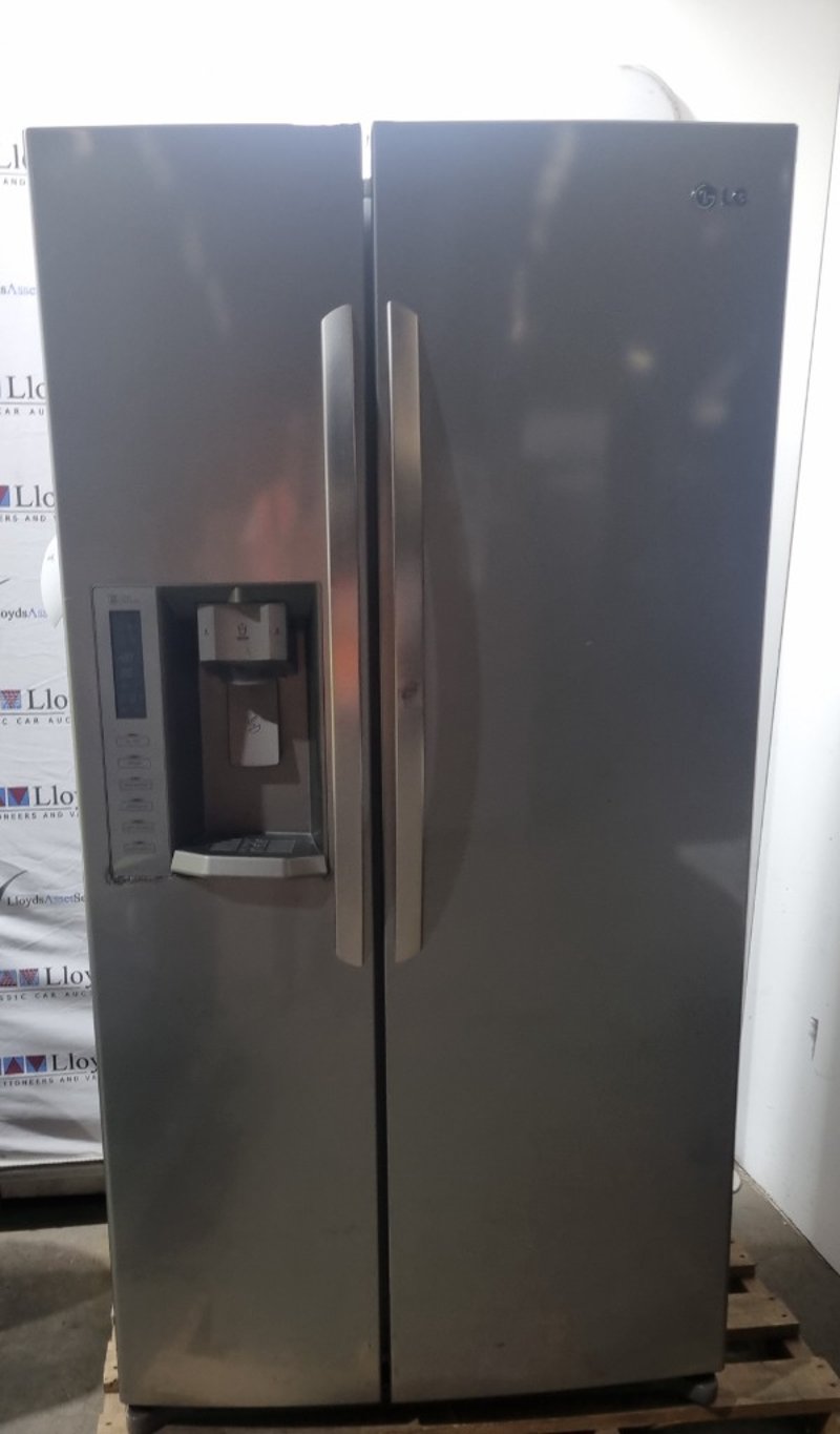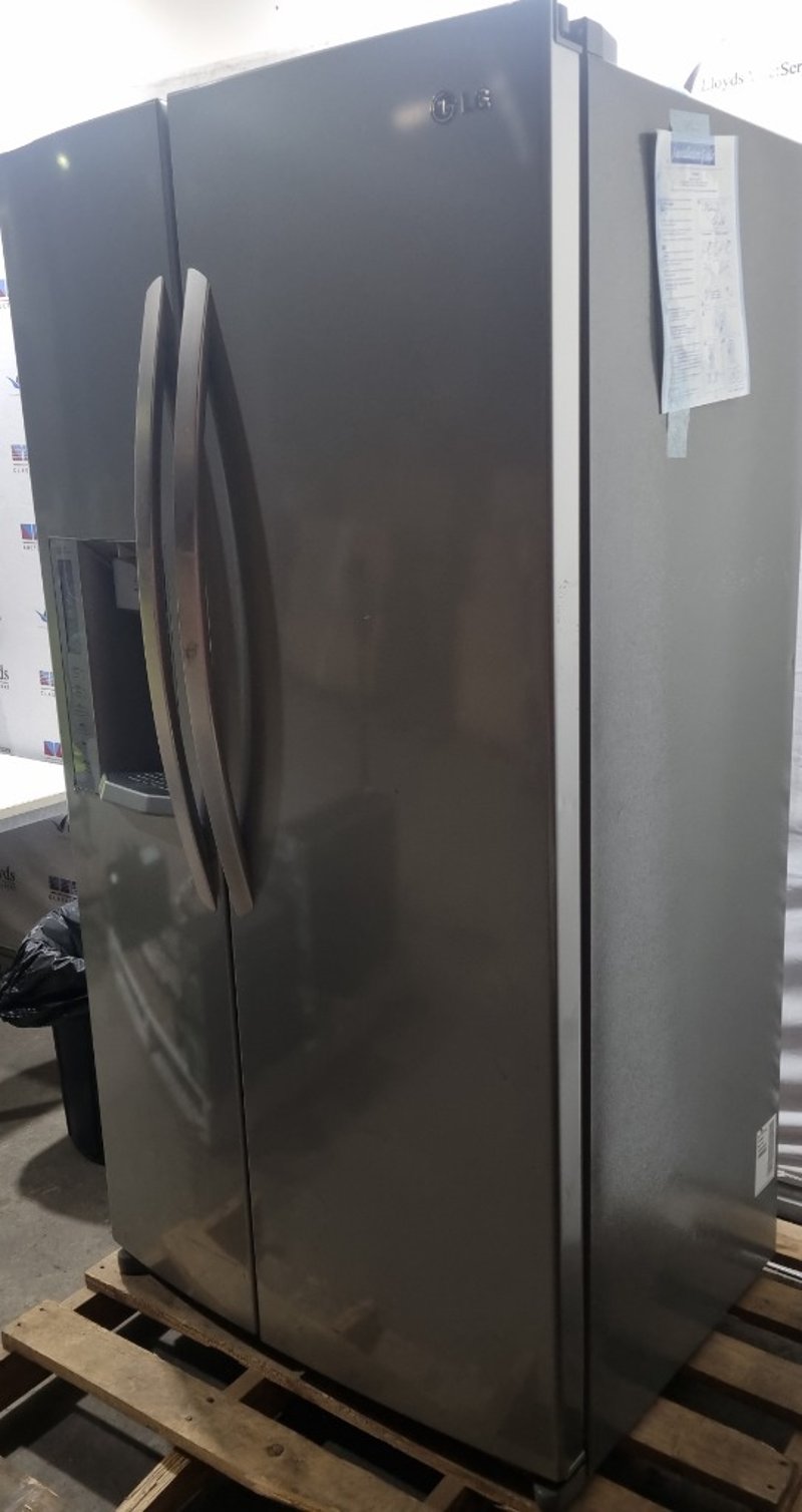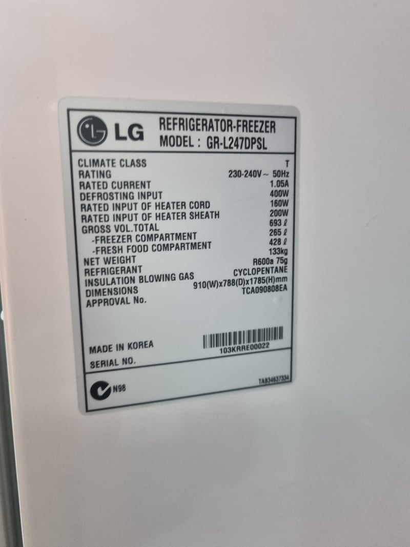 LG GR-L247DPSL Side-by-Side Refrigerator-Freezer in stainless steel finish. Model features 647L total capacity with 428L freezer compartment and 133L fresh food section. Equipped with ice and water dispenser on the door, multiple shelving systems, and vacuum fresh storage drawer. Unit operates on 230-240V, 50Hz with rated current of 1.05A. Manufactured in Korea with cyclopentane refrigerant. Dimensions: 91 x 61 x 179cmNote: untested,signs of wear
