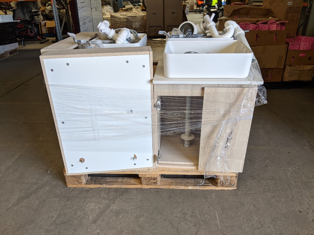 Pallet of mixed bathroom fixtures - Listing includes:- Toilet – Ceramic unit, Approx dims: 81 x 38 x 62cm- Vanity cabinets – Light wood finish, integrated ceramic basins. Approx dims: 65 x 60/75 x 47cm- Vanity mirror unit – Light wood finish, double mirror compartment, open component space. Approx dims: 80 x 75/60 x 15.5cm- Assorted Fixtures – Hoses, fittings & accessoriesNote: Items are sold as-is. Some pieces may be incomplete, show signs of wear or have structural damage
