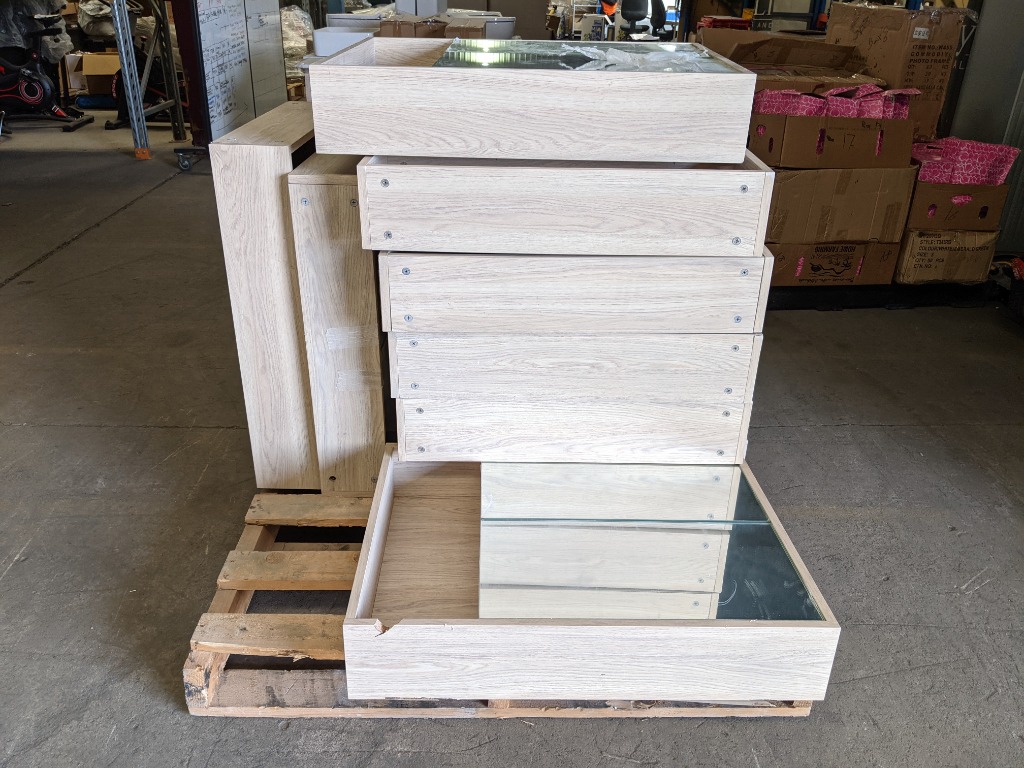 Pallet of vanity mirror units – Light wood finish, double mirror compartment, open component space. Approx dims: 80 x 75/60 x 15.5cmNote: Items are sold as-is. Some pieces may show signs of wear or have structural damage