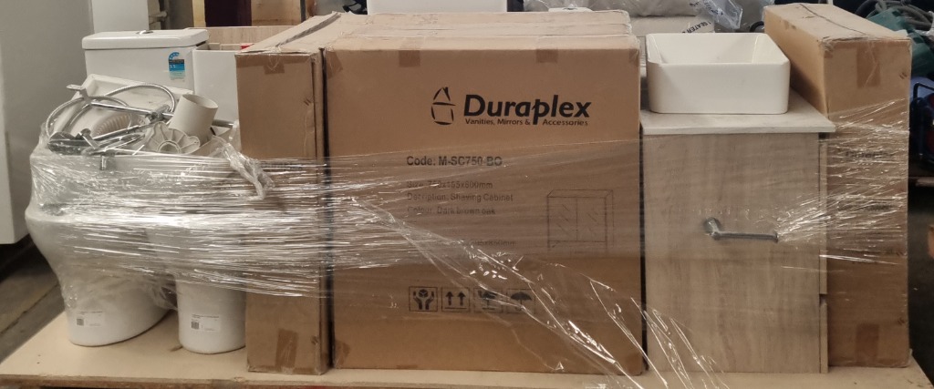 Pallet of mixed bathroom fixtures - Listing includes:- Toilet – Ceramic unit, Approx dims: 81 x 38 x 62cm- Vanity cabinets – dark brown oak finish, integrated ceramic basins. Approx dims: 66 x 20.5 x 85cm & 75 x 15.5 x 80cm - Assorted Fixtures – Hoses, fittings & accessoriesNote: Items are sold as-is. Some pieces may be incomplete, show signs of wear or have structural damage