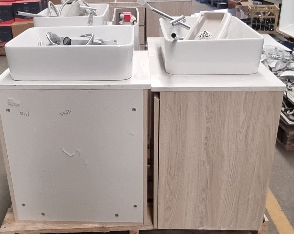 Pallet of mixed bathroom fixtures - Listing includes: - Toilets – Ceramic units, some with tanks & lids. Approx dims: 81 x 38 x 62cm - Vanity cabinets – Light wood finishes with integrated ceramic basins. Approx dims: 62 x 61 x 47cm - Assorted Fixtures – Hoses, fittings & accessories Note: Items are sold as-is. Some pieces may be incomplete, show signs of wear or have structural damage