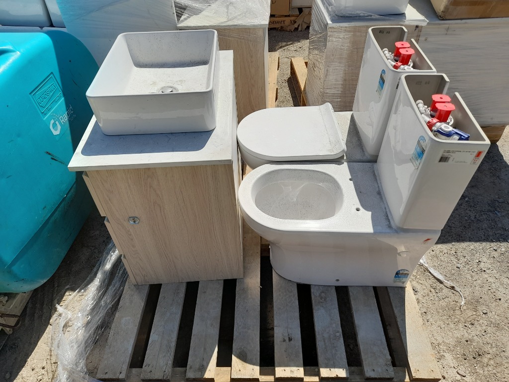Pallet of mixed bathroom fixtures - Listing includes: - Toilets – Ceramic unit, Approx dims: 81 x 38 x 62cm - Vanity cabinet – Light wood finish, integrated ceramic basins. Approx dims: 65 x 60/75 x 47cm Note: Items are sold as-is. Some pieces may be incomplete, show signs of wear or have structural damage SOLD AS LOT