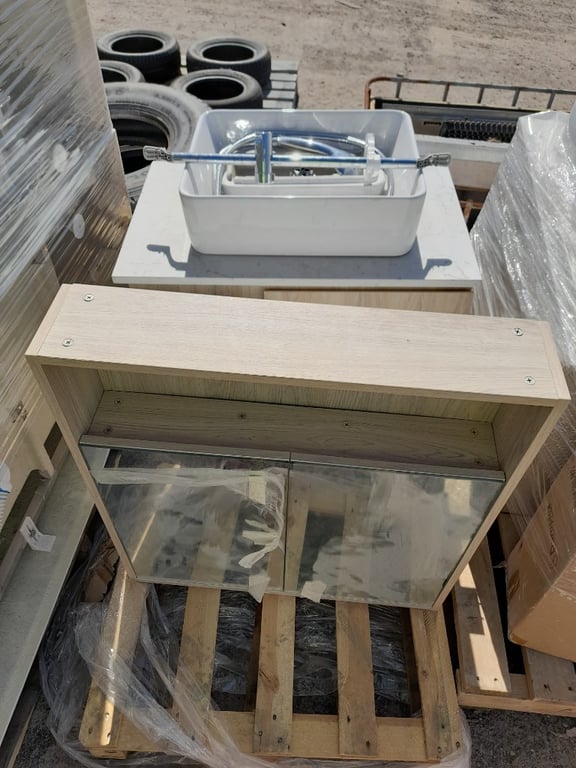 Pallet of mixed bathroom fixtures - Listing includes: - Shaving cabinet – dims: 65 x 20.5 x 85cm - Vanity cabinets – Light wood finish, integrated ceramic basins. Approx dims: 65 x 60/75 x 47cm - Assorted Fixtures – Hose & shower fittings & accessories Note: Items are sold as-is. Some pieces may be incomplete, show signs of wear or have structural damage SOLD AS LOT