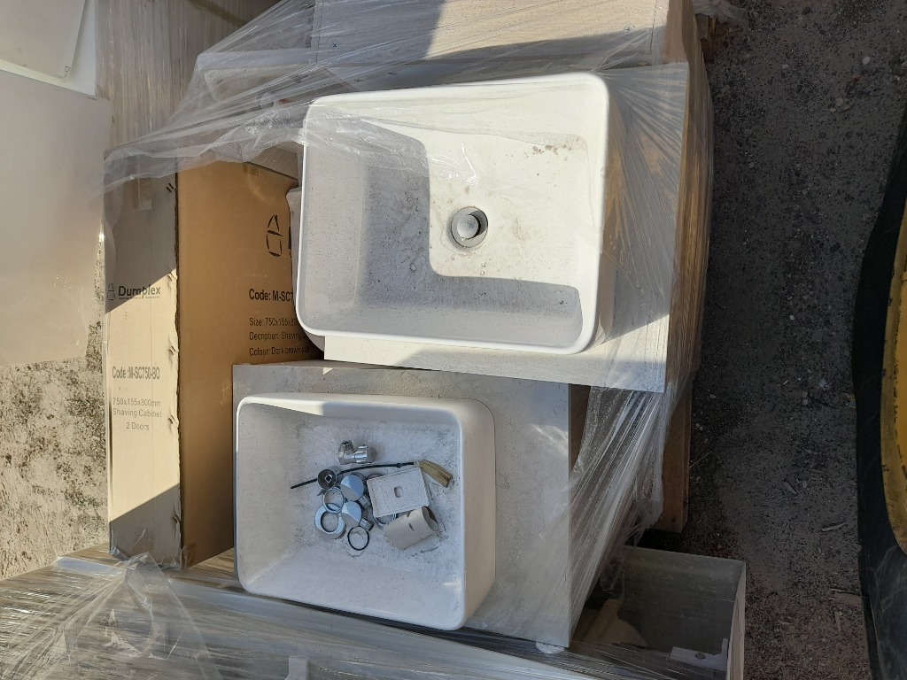 Pallet of mixed bathroom fixtures - Listing includes:- Toilet – Ceramic unit, Approx dims: 81 x 38 x 62cm- Shaving cabinet – dims: 75 x 15.5 x 80cm - Vanity cabinets – Light wood finish, integrated ceramic basins. Approx dims: 65 x 60/75 x 47cm- Assorted Fixtures – Hose fittings & accessoriesNote: Items are sold as-is. Some pieces may be incomplete, show signs of wear or have structural damage