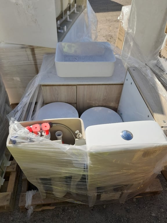 Pallet of mixed bathroom fixtures - Listing includes:- Toilets – Ceramic unit, Approx dims: 81 x 38 x 62cm- Shaving cabinet – dims: 65 x 20.5 x 85cm - Vanity cabinet – Light wood finish, integrated ceramic basins. Approx dims: 65 x 60/75 x 47cmNote: Items are sold as-is. Some pieces may be incomplete, show signs of wear or have structural damage