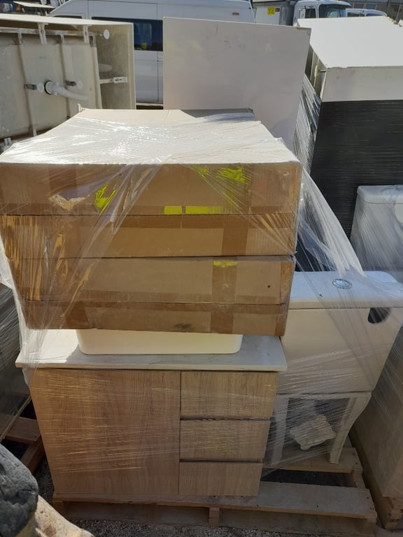 Pallet of mixed bathroom fixtures - Listing includes:- Toilet – Ceramic unit, Approx dims: 81 x 38 x 62cm- Shaving cabinets – dims: 60 x 15.5 x 80cm - Vanity cabinets – Light wood finish, integrated ceramic basins. Approx dims: 65 x 60/75 x 47cm- Assorted Fixtures – Hose & shower fittings & accessoriesNote: Items are sold as-is. Some pieces may be incomplete, show signs of wear or have structural damage