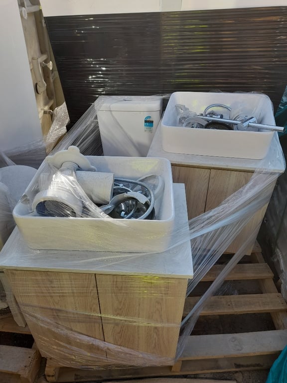 Pallet of mixed bathroom fixtures - Listing includes:- Toilet – Ceramic unit, Approx dims: 81 x 38 x 62cm- Vanity cabinets – Light wood finish, integrated ceramic basins. Approx dims: 65 x 60/75 x 47cm- Assorted Fixtures – Hose & shower fittings & accessoriesNote: Items are sold as-is. Some pieces may be incomplete, show signs of wear or have structural damage