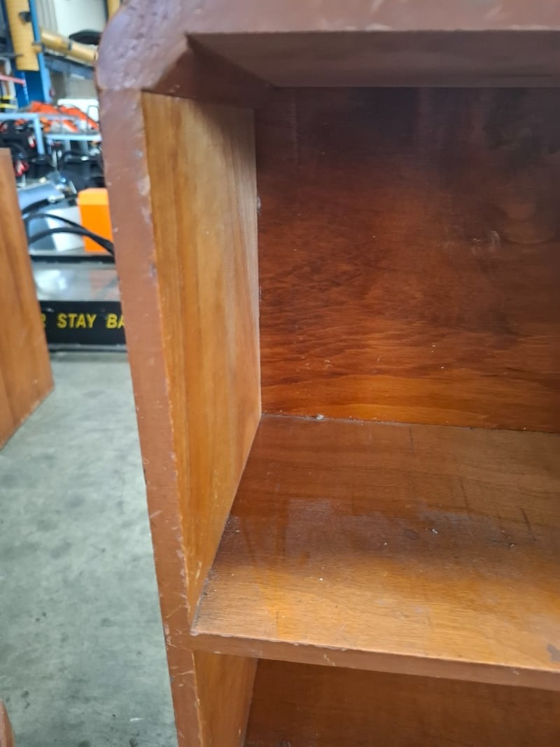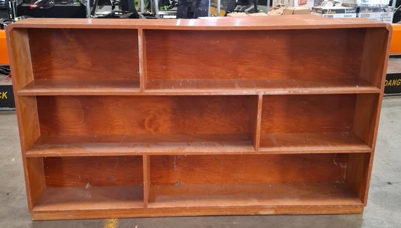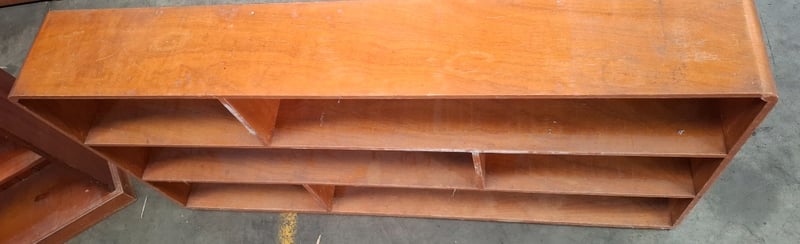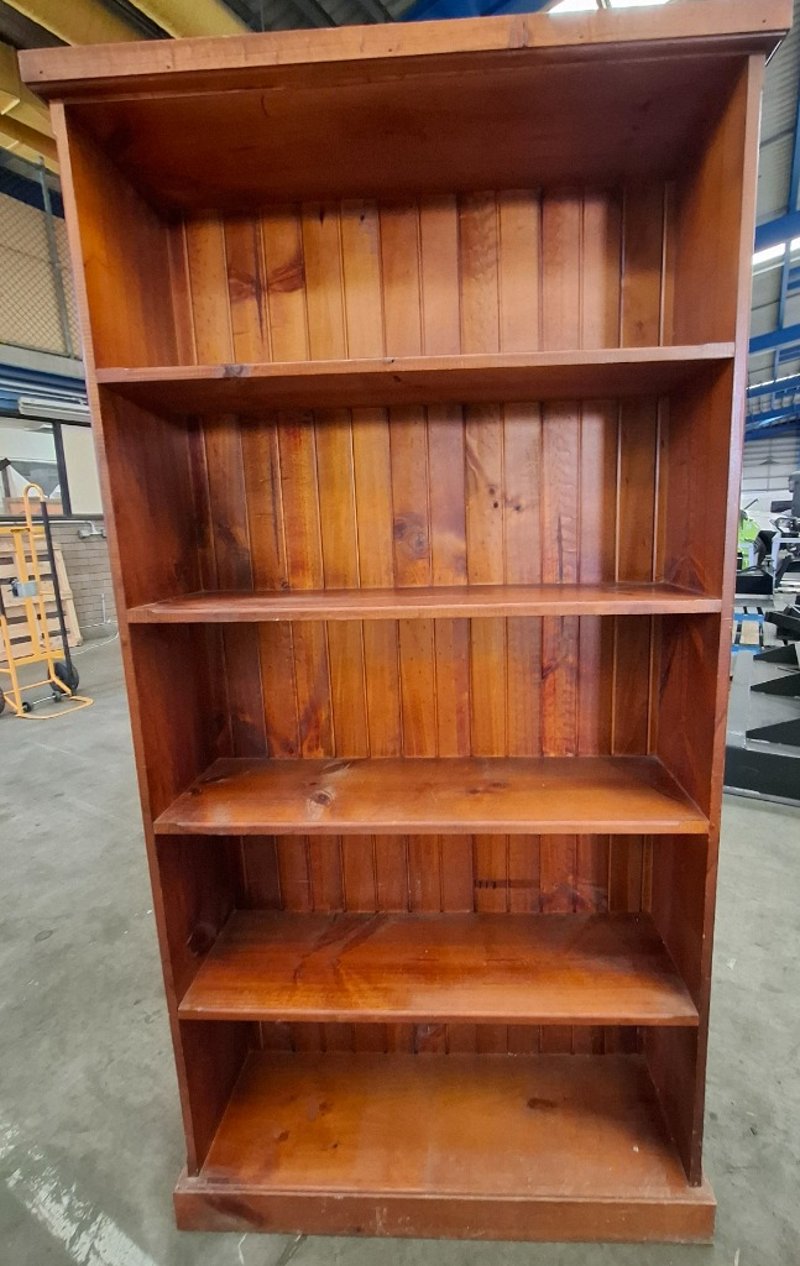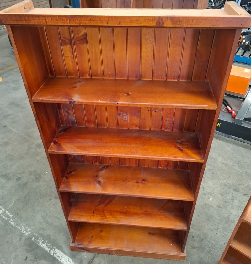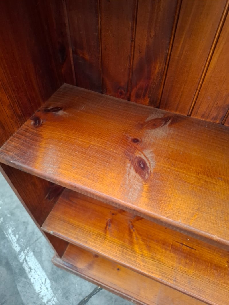2 x bookcases, 1 Brown with 4 shelves and 1 tan with 6 spaces, both have dints, scratches, scuffs on some surfaces.