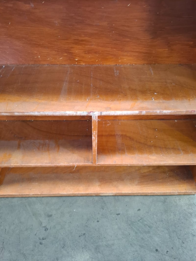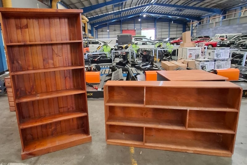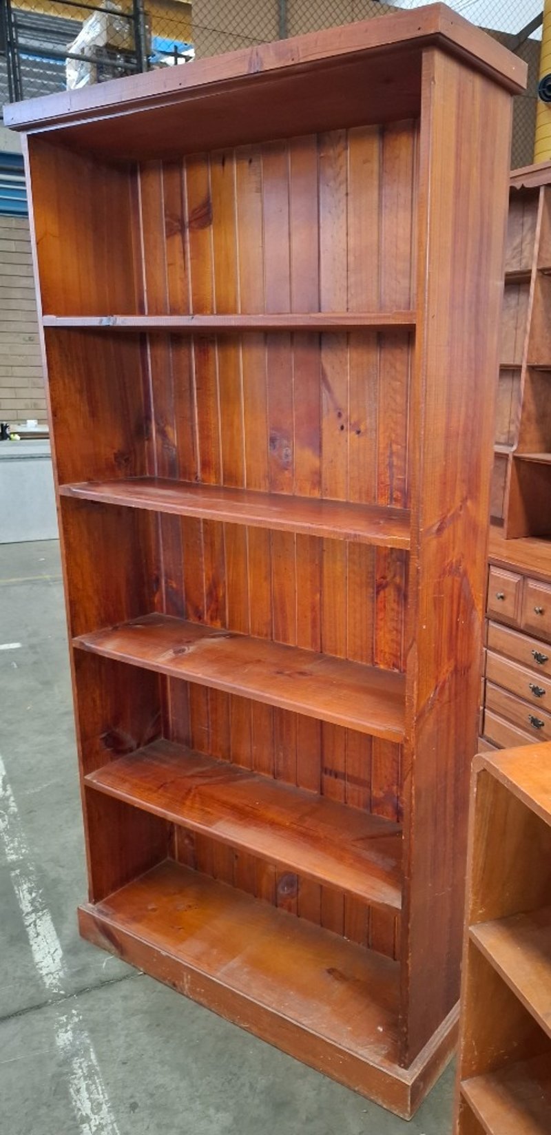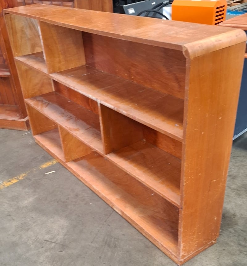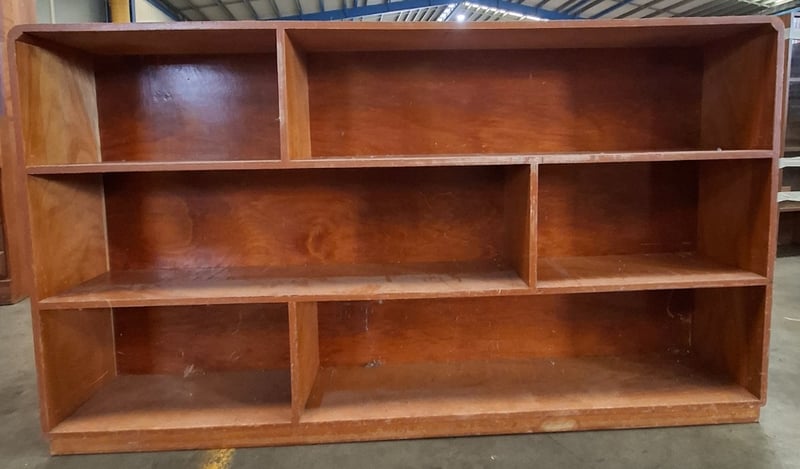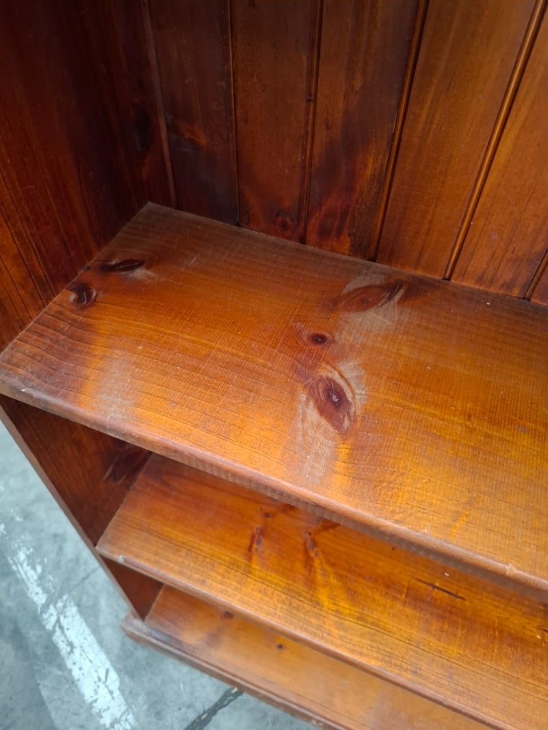 2 x bookcases, 1 Brown with 4 shelves and 1 tan with 6 spaces, both have dints, scratches, scuffs on some surfaces.