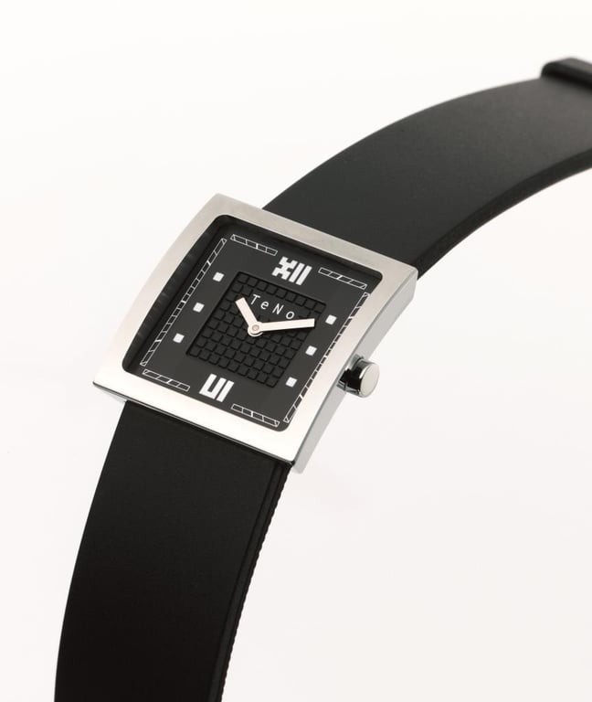 TENO WATCH CARYA LADY Brand: Teno Model Number: 089.1002.01 Dial: Black with printed markers Case: Stainless steel Bracelet: Black rubber strap Swiss Made, Curved Sapphire Crystal, 26X26Mm26 X 26 Mm Condition: Good - Refer to Images FC