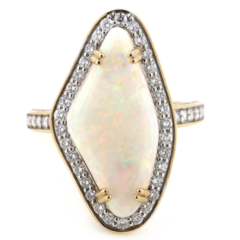14K YELLOW GOLD, 4.38CT AUSTRALIAN COOBER PEDY OPAL AND DIAMOND, HALO RING. The Centre Features, One Free Form Cabochon Cut, Australian Coober Pedy Opal (4.38Ct, Red, Orange, Yellow, Green, Blue, Purple Colour Play), Double Claw Set. Decorating The Setting And Band Are, 128 Round Brilliant Cut, Diamonds (0.98Ct Tdw, G-I Colour, Si-I1-Clarity), Bead Set. Ring Size O. Valuations Provided by an Independent Third-Party Professional Not Directly Associated With Lloyds Auctions at AUD $$22,000.00This valuation has been conducted by an independent third-party professional. The valuation amount is an assessment by the issuing valuer and does not reflect the auction value of the item. Any inquiries regarding the valuation should be directed to the issuing valuer (refer to contact details on the certificate), as Lloyds Auctions has no affiliation or influence over the valuation, the valuer, or the stated amount. Condition: Good - Refer Images 0645830+8021