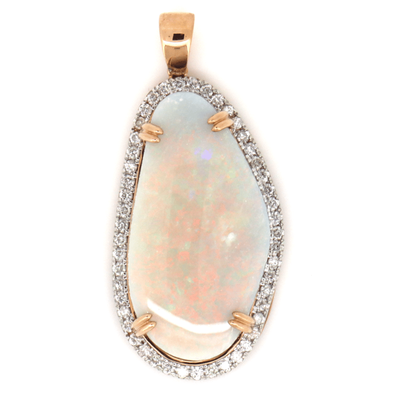 14K ROSE GOLD, 15.72CT AUSTRALIAN COOBER PEDY OPAL AND DIAMOND, STATEMENT PENDANT. The Centre Features, One Free-Form Cabochon Cut, Grey Base, Australian Coober Pedy Opal (15.72Ct, Red, Orange, Green, Violet, Purple Colour Play, Broad Flash Pattern), Double 4 Claw Set. Surrounding The Centre Are, 49 Round Brilliant Cut, Diamonds (0.49Ct Tdw, H-J Colour, P1+ Clarity), Bead Set. Valuations Provided by an Independent Third-Party Professional Not Directly Associated With Lloyds Auctions at AUD $$15,200.00This valuation has been conducted by an independent third-party professional. The valuation amount is an assessment by the issuing valuer and does not reflect the auction value of the item. Any inquiries regarding the valuation should be directed to the issuing valuer (refer to contact details on the certificate), as Lloyds Auctions has no affiliation or influence over the valuation, the valuer, or the stated amount. Condition: Good - Refer Images 0645830+8053