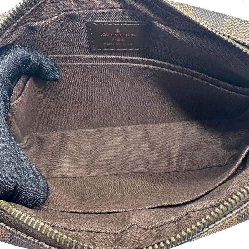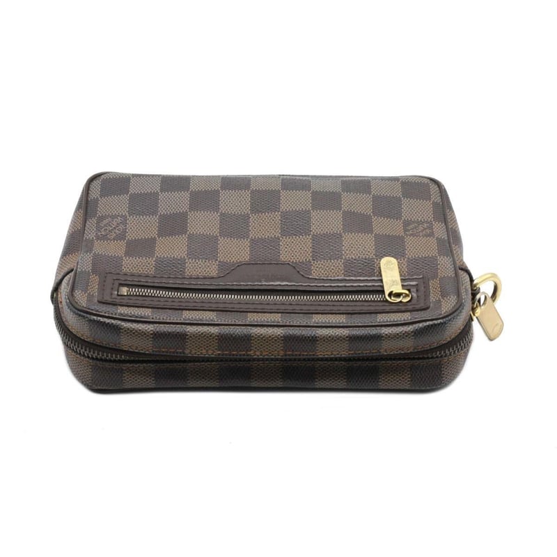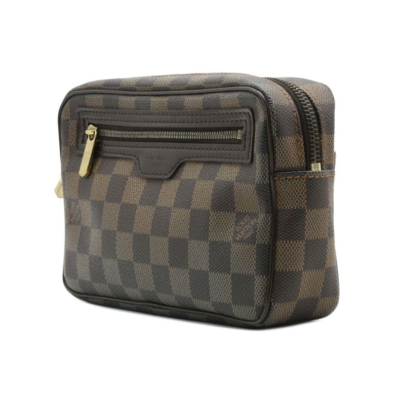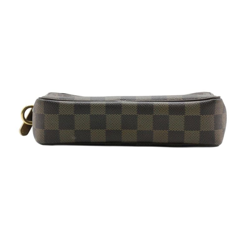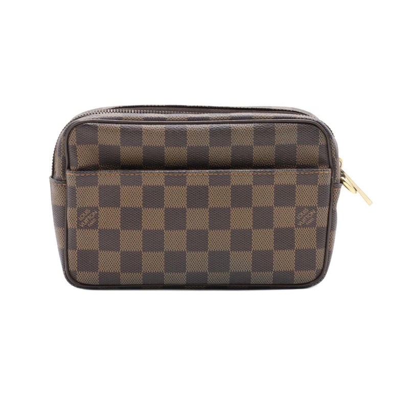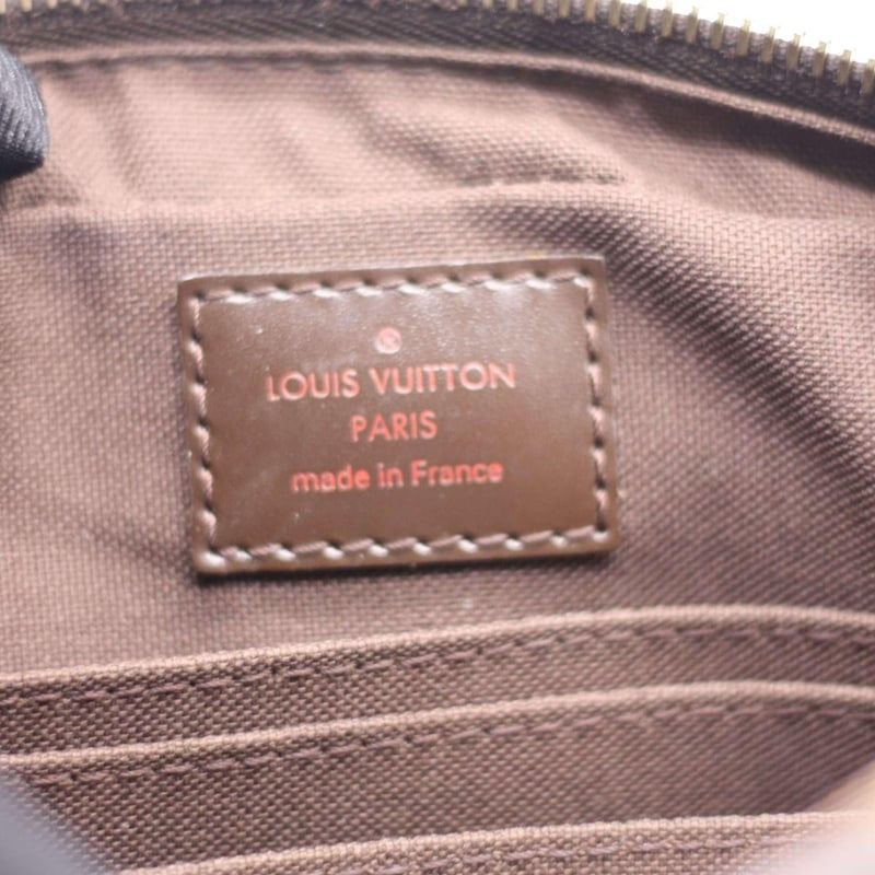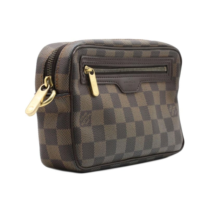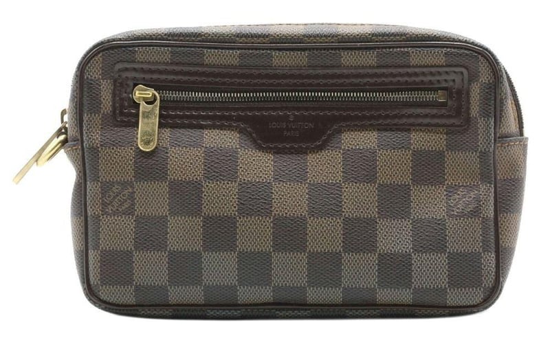 Damier ebene canvas and leather trim with gold-tone hardware, a front zipped pocket, a rear pocket and top zip closure.