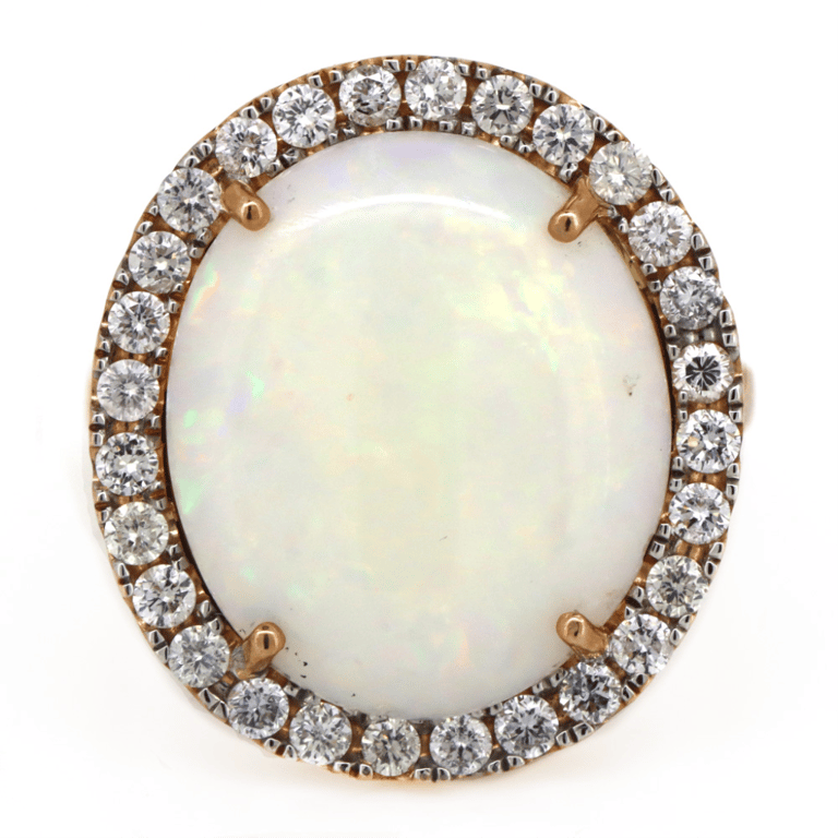 14K ROSE GOLD, WHITE OPAL AND DIAMOND, HALO RING. The Centre Features, One Oval Cabochon Cut, Natural White Solid, Opal (4.48Ct, Yellow, Orange, Green, Blue Colour Play), 4 Claw Set. Surrounding The Centre In A Halo Are, 28 Round Brilliant Cut, Diamonds (0.67Ct Tdw, I-J Colour, Si1-P1 Clarity), Bead Set. Ring Size N. Valuations Provided by an Independent Third-Party Professional Not Directly Associated With Lloyds Auctions at AUD $$16,000.00This valuation has been conducted by an independent third-party professional. The valuation amount is an assessment by the issuing valuer and does not reflect the auction value of the item. Any inquiries regarding the valuation should be directed to the issuing valuer (refer to contact details on the certificate), as Lloyds Auctions has no affiliation or influence over the valuation, the valuer, or the stated amount. Condition: Good - Refer Images 0645830+8065