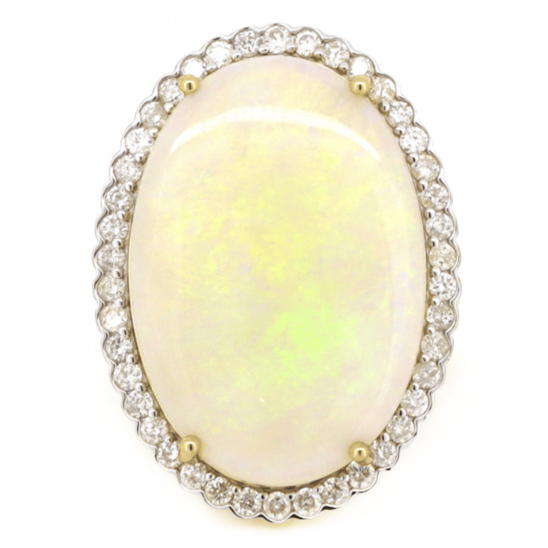 14K YELLOW GOLD, 7.58CT AUSTRALIAN COOBER PEDY OPAL AND DIAMOND, STATEMENT RING. The Centre Features, One Oval Cabochon Cut, Australian Coober Pedy Opal (7.58Ct, Green, Violet, Yellow And Orange Colour Play), Claw Set. Surrounding The Centre Are, 42 Round Brilliant Cut, Diamonds (0.63Ct Tdw, J-K Colour, Si1-Si2 Clarity), Semi-Bezel Bead Set In White Gold. Ring Size L 1/2. Valuations Provided by an Independent Third-Party Professional Not Directly Associated With Lloyds Auctions at AUD $$12,890.00This valuation has been conducted by an independent third-party professional. The valuation amount is an assessment by the issuing valuer and does not reflect the auction value of the item. Any inquiries regarding the valuation should be directed to the issuing valuer (refer to contact details on the certificate), as Lloyds Auctions has no affiliation or influence over the valuation, the valuer, or the stated amount. Condition: Good - Refer Images 0645830+8008