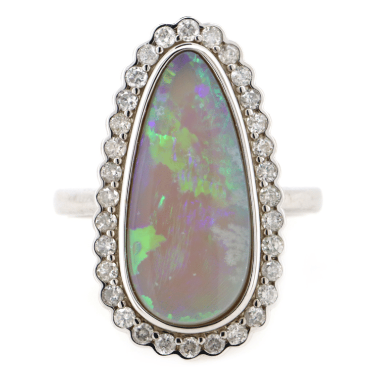 14K WHITE GOLD, 3.49CT AUSTRALIAN ANDAMOOKA OPAL AND DIAMOND, HALO RING. The Centre Feature, One Pear Cabochon Cut, Australian Andamooka Opal (3.49Ct, Green, Violet, Yellow, Blue, Pink Strong Colour Play), Bezel Set. Surrounding The Centre In A Halo Are, 32 Round Brilliant Cut, Diamonds (0.48Ct Tdw, J-K Colour, Si1-Si2 Clarity), Micro-Claw Set. Ring Size M. Valuations Provided by an Independent Third-Party Professional Not Directly Associated With Lloyds Auctions at AUD $$9,490.00This valuation has been conducted by an independent third-party professional. The valuation amount is an assessment by the issuing valuer and does not reflect the auction value of the item. Any inquiries regarding the valuation should be directed to the issuing valuer (refer to contact details on the certificate), as Lloyds Auctions has no affiliation or influence over the valuation, the valuer, or the stated amount. Condition: Good - Refer Images 0645830+8041