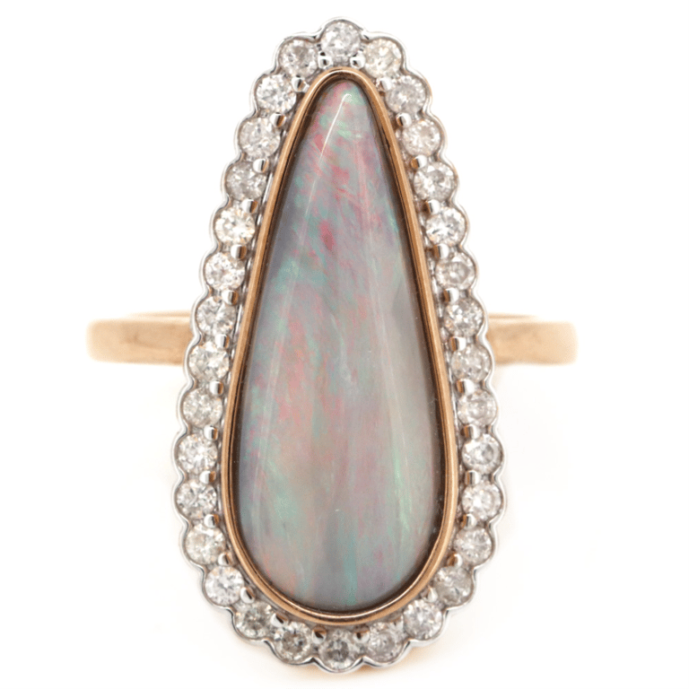 The Centre Features, One Pear Cabochon Cut, Grey Base, Australian Lightning Ridge Opal (3.90Ct, Flashes Of Shades Green Of Blue, Purple, Red And Orange, Slight-Moderate Inclusions), Bezel Set. Surrounding The Centre In A Halo Are, 32 Round Brilliant Cut, Diamonds (0.49Ct Tdw, H-K Colour, P2+ Clarity), Micro-Bead Set. Ring Size M.