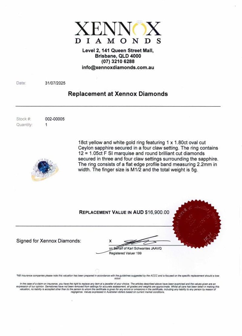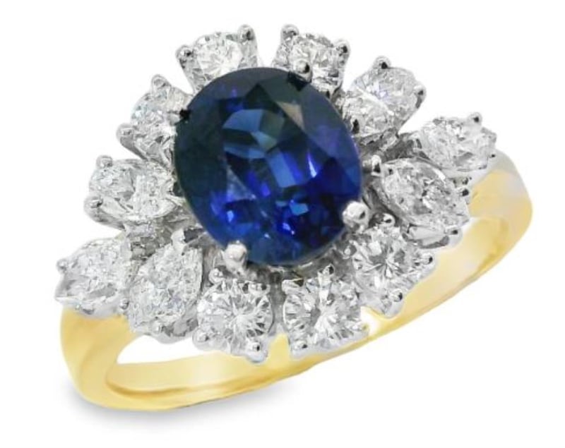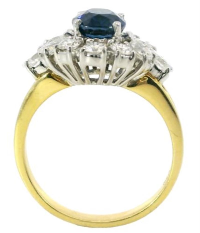 18Ct Yellow And White Gold Ring, Showcasing A Stunning 1.80Ct Oval Cut Ceylon Sapphire Elegantly Secured In A Four-Claw Setting. Adorned With 12 Dazzling Diamonds Totaling 1.05Ct, Featuring Marquise And Round Brilliant Cuts, Delicately Set In Three And Four-Claw Settings To Accentuate The Brilliance Of The Sapphire. Crafted With A Sleek Flat Edge Profile Band Measuring 2.2Mm In Width, This Ring Exudes Timeless Elegance And Sophistication. Finger Size Of M1/2 And A Total Weight Of 5G