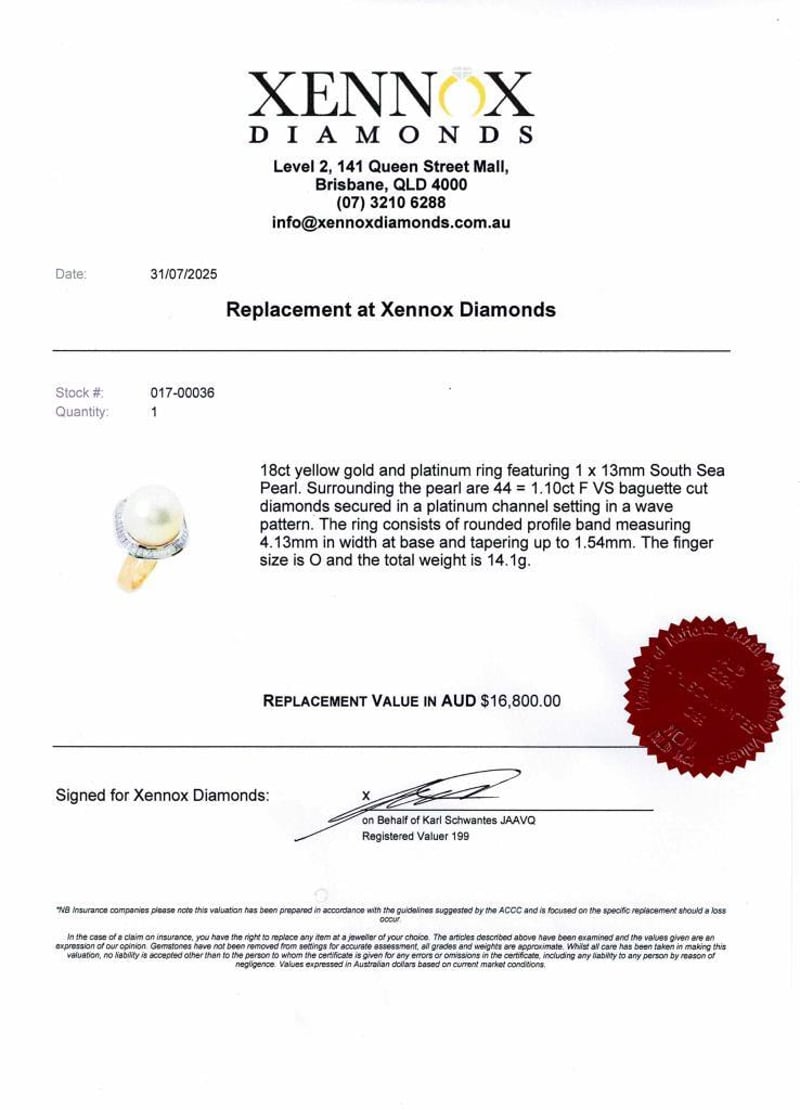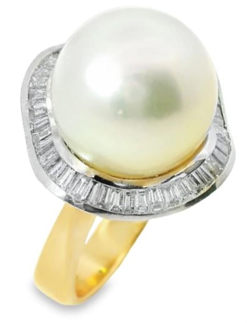 18Ct Yellow Gold And Platinum Ring, A Symbol Of Timeless Elegance. Featuring A Radiant 13Mm South Sea Pearl Embraced By 44 Sparkling Baguette Cut Diamonds Totaling 1.10 Carats, This Ring Is A Masterpiece Of Sophistication. Set In A Platinum Channel In A Graceful Wave Pattern, The Diamonds Add A Touch Of Allure To Its Design. With A Comfortable Rounded Profile Band Measuring 4.13Mm At The Base And Tapering To 1.54Mm, It'S Perfect For Finger Size O. Weighing 14.1G