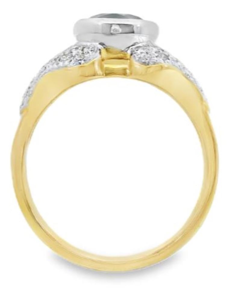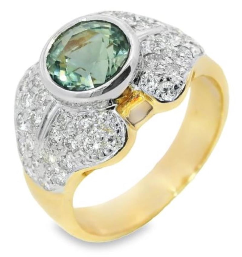 18CT YELLOW GOLD & WHITE GOLD TOURMALINE & NATURAL DIAMOND RING Total Item Weight: 8gms 18Ct Yellow And White Gold Ring, Showcasing A Magnificent 1.63Ct Round Brilliant Cut Mint Tourmaline Set In A Bezel Setting. Adorned With 46 Brilliant F Si Round Cut Diamonds Totalling 0.63Ct, Delicately Arranged In A Pave Setting Along The Shoulders, This Ring Exudes Sophistication And Charm. Crafted With A Slightly Rounded Profile Band Measuring 4Mm In Width At The Base Of The Shank, It Offers Both Comfort And Style. With A Finger Size Of M And A Total Weight Of 8G, This Captivating Ring Is A Beautiful Addition To Any Collection 0 584828+7