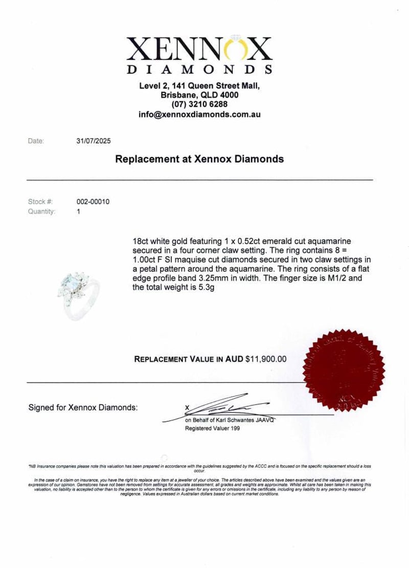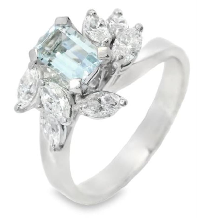 18CT WHITE GOLD AQUAMARINE & NATURAL DIAMOND RING Total Item Weight: 5.3gms Adorned With A Mesmerizing 0.52Ct Emerald Cut Aquamarine, Delicately Secured In A Four-Corner Claw Setting, This Piece Exudes Sophistication. Surrounding The Aquamarine Are Eight Dazzling Marquise Cut Diamonds Totalling 1.00Ct, Set In A Petal Pattern For An Enchanting Allure. Crafted With Precision, The Ring Boasts A Sleek 3.25Mm Width Flat Edge Profile Band, Ensuring Comfort And Style. With A Finger Size Of M1/2 And A Total Weight Of 5.3G 0 584828+14