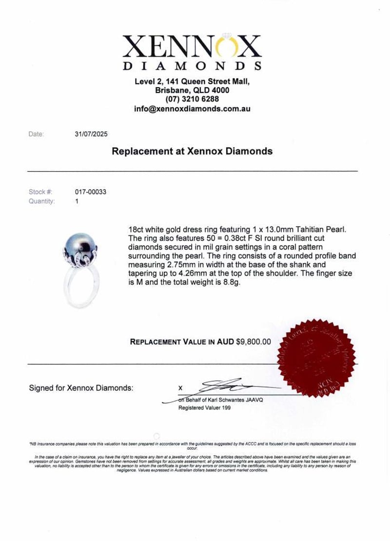 18Ct White Gold Dress Ring, Designed To Captivate The Hearts Of Discerning Women. At Its Center Lies A Luminous 13.0Mm Tahitian Pearl, Radiating Sophistication And Grace, Encircled By A Mesmerizing Coral Pattern Crafted From 50 Brilliant Round Cut Diamonds Totaling 0.38Ct. Delicate Mil Grain Settings Add An Extra Touch Of Celestial Sparkle To This Enchanting Piece. The Ring'S Sleek Rounded Profile Band, Tapering From 2.75Mm At The Base Of The Shank To 4.26Mm At The Top Of The Shoulder, Ensures Both Comfort And Style. With A Finger Size Of M And A Total Weight Of 8.8G, This Ring Is A Symbol Of Refined Luxury And Timeless Beauty
