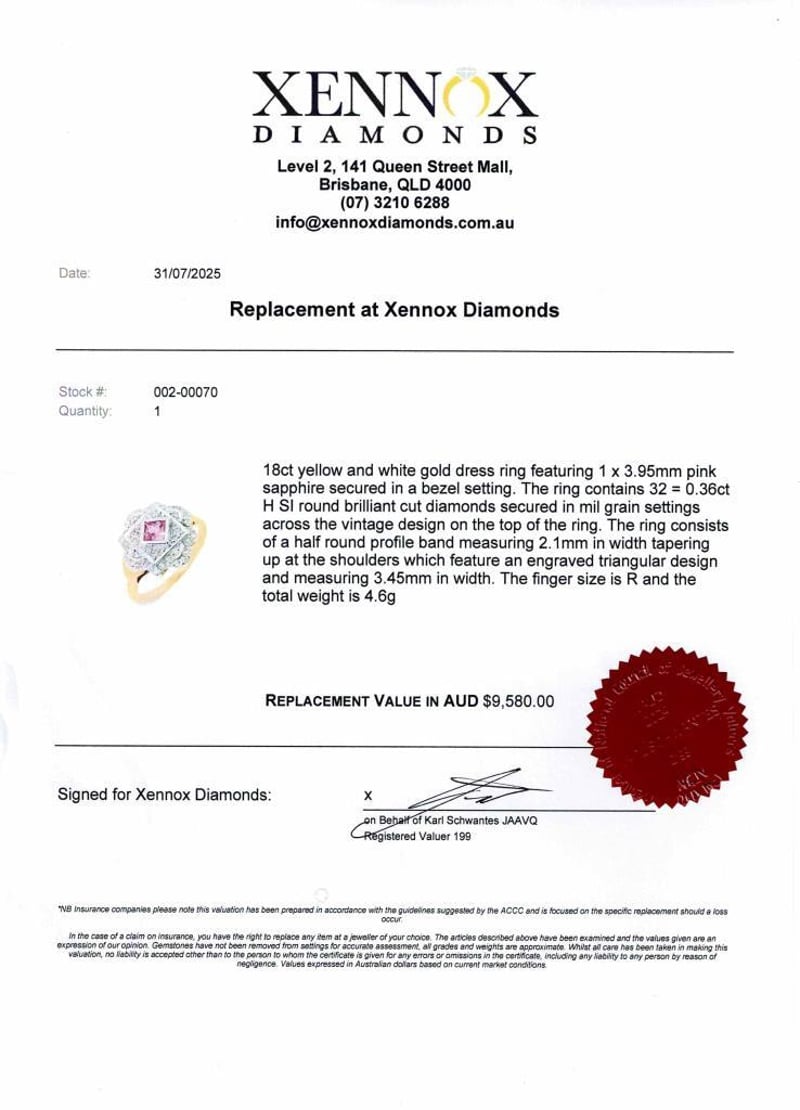 Central 3.95Mm Pink Sapphire, Delicately Secured In A Bezel Setting, Emanating A Soft, Radiant Glow. Embellished With 32 Brilliant H Si Round Brilliant Cut Diamonds, Totaling 0.36Ct, Meticulously Placed In Milgrain Settings, The Vintage-Inspired Design Exudes Understated Elegance. The Half-Round Profile Band, Measuring 2.1Mm In Width And Gracefully Tapering At The Shoulders Adorned With Intricately Engraved Triangular Motifs, Ensures Both Comfort And Style. A Finger Size Of R And A Total Weight Of 4.6G