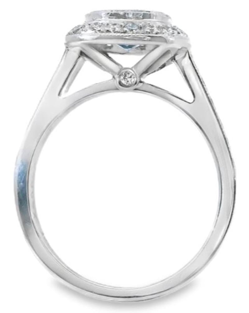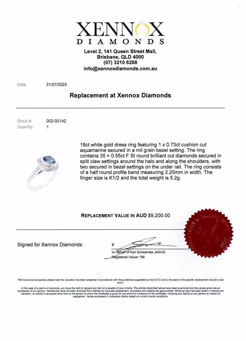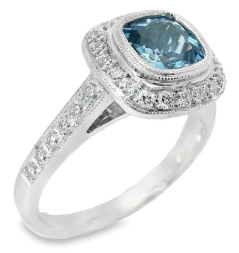 18Ct White Gold Dress Ring Adorned With A Stunning 0.73Ct Cushion Cut Aquamarine Delicately Nestled In A Milgrain Bezel Setting. Surrounding The Captivating Centerpiece Are 35 Brilliant F Si Round Cut Diamonds Totalling 0.55Ct, Meticulously Secured In Split Claw Settings Along The Halo And Shoulders, With Two Additional Diamonds Elegantly Placed In Bezel Settings On The Under Rail. The Ring Boasts A Sleek Half-Round Profile Band, Measuring 2.25Mm In Width, Ensuring Both Elegance And Comfort. With A Finger Size Of K1/2 And A Total Weight Of 5.2G
