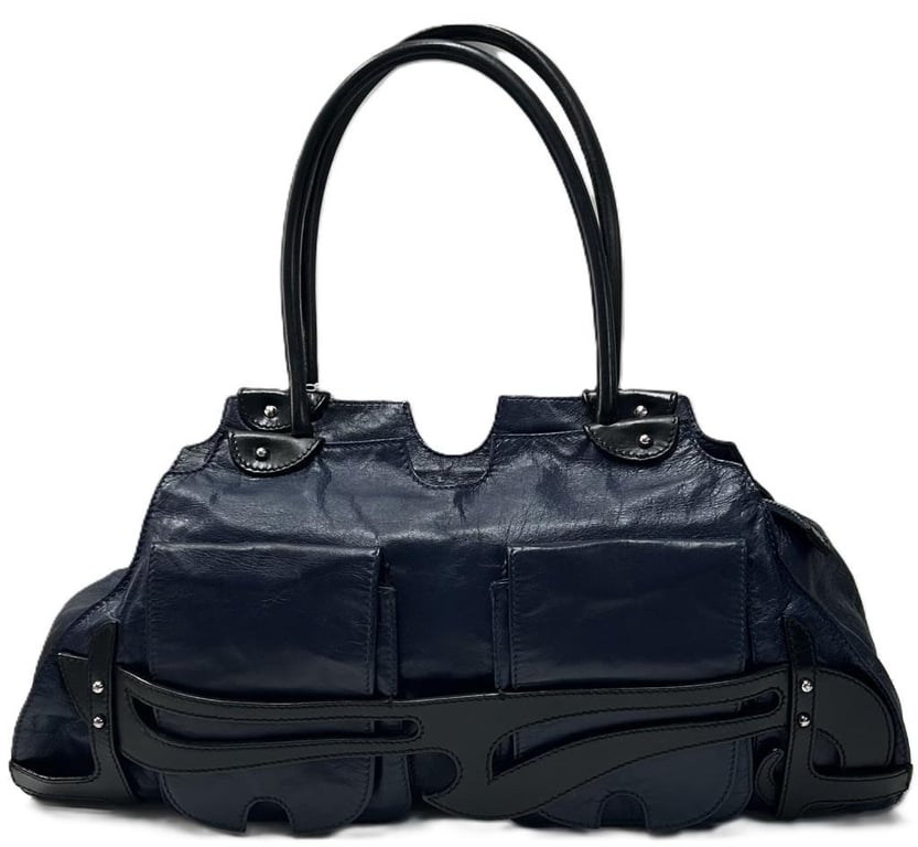 FENDI NAVY/BLACK LEATHER SHOULDER HANDBAG. 2 Rolled Top Handles, Top Zip Closure With Ff Metal Pull Tag, 2 Front Pockets With Fold Over Flap Closure, Black Rib Nylon Lining. Made In Italy. Comes With Certificate Of Authenticity. Condition: Good - Refer To Images 162942+33931
